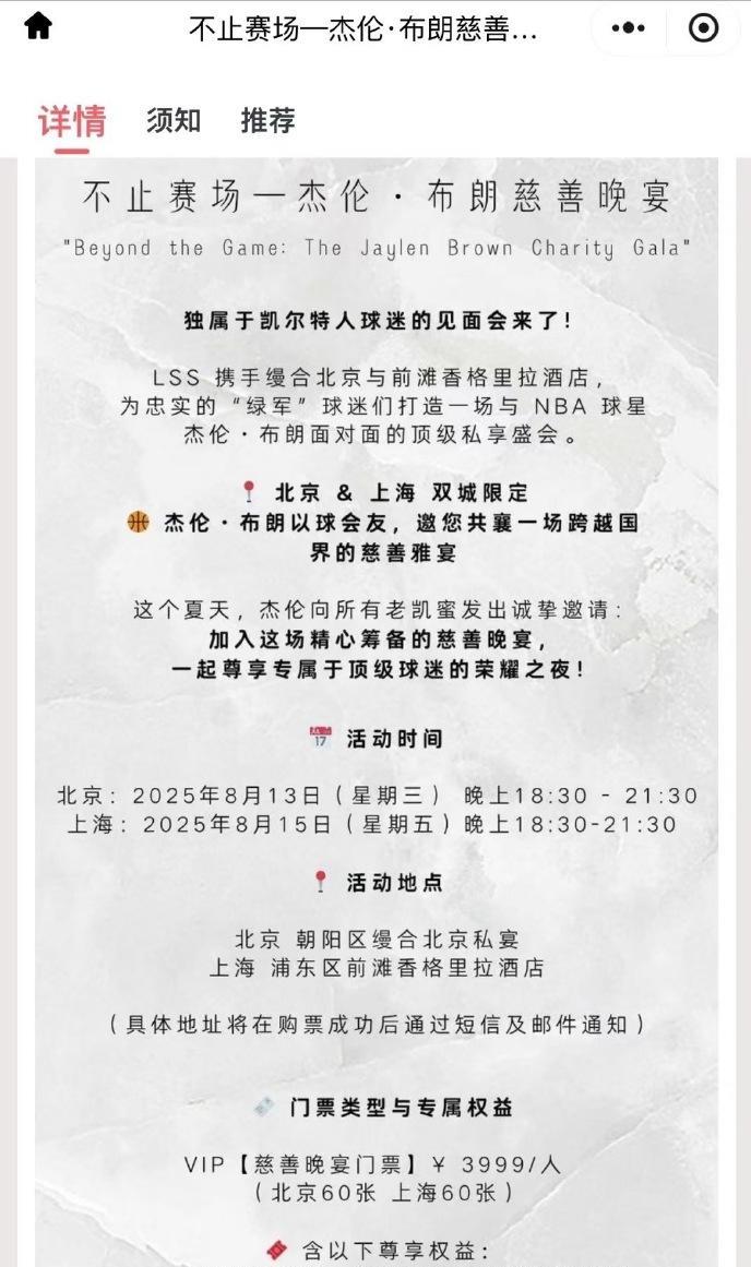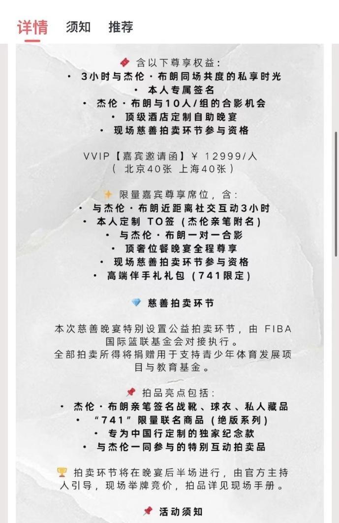 离谱!网传杰伦-布朗晚宴VIP见面会,最高票价达到12999! 既然是慈善晚宴,就不是普通人能参加的,在公众平台上公开售卖晚宴的门票,也分成3999和12999两个档次,其中的大致区别如下: 3999:签名,10人一组合影, 12999:TO签,一对一合影,伴手礼 按照过往球星的操作(例如梅西球迷晚宴),杰伦布朗这个价格并不算贵,理由也很简单,他的级别没有到巨星那个份上,且这次把高端球迷见面会搞成慈善晚宴,有点筛选球迷的意思了,这次进去再拍两件拍品,以后再搞杰伦布朗中国行,就可以发邀请函了。