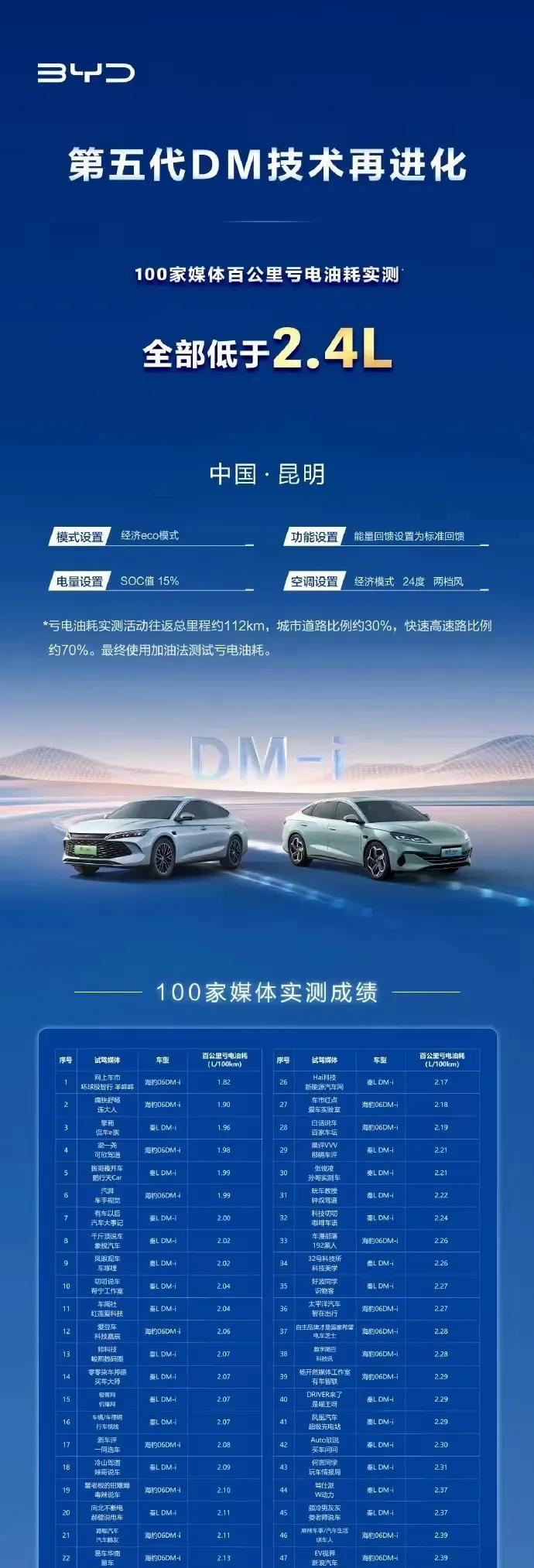 比亚迪第五代dm技术,ota优化后油耗再降10%,日系偷油塔的天都塌了。 百家媒体集体测试秦l、海豹06,往返里程112公里,城市道路30%高快道路70%,初始电量为soc 15%亏电状态,驾驶模式为eco经济模式,能量回馈设置为标准回馈,空调24度二档风,测试油耗全部低于百公里2.4升。 就说这个油耗,日系车大夏天不开空调龟速行驶,红绿灯前100米开始溜车,灯亮龟速起步,都不一定开得出这个油耗,信仰崩塌了这以后还怎么玩。 一些嘴硬的油车老顽固还在拿高速油耗说事,大部分人一年跑高速有10%吗?城市路和快速路不就是每天通勤路程吗?不要拿你们的最低油耗挑战人家的最高油耗,dmi就是省油王者,比亚迪插混就是油电混动的最佳形态。