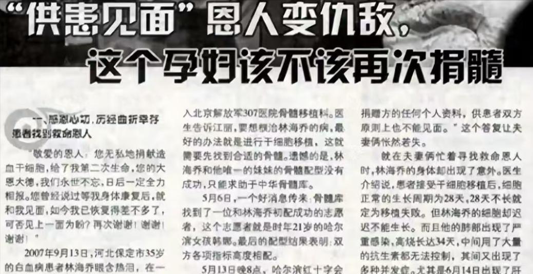 2006年,黑龙江一21岁女生,无偿捐献骨髓救助白血病男子。一年后女生怀孕,男子病情复发便要求女生打胎救命。女生拒绝后男子离世,男子妻子一怒之下将女生告上法庭。 2006年,河北的林大哥突发白血病,直接昏倒在单位。当检查结果出来时,他感觉自己已经没救了。 因为白血病不仅需要大量的近金钱,还需要合适的骨髓移植。而林大哥作为一个普通的打工人,家里的生活并不算富裕,平时的工资也就刚好够一家人生活。 幸好,当林大哥的家人得知后,并没有因为家里资金困难就放弃给他治疗。还对他说,就算砸锅卖铁也要让他得到治疗。 然而,经过一段时间的治疗,林大哥的病情虽然有所好转,但想要治愈还需要一个合适的骨髓,这可把林大哥一家难住了。 显然钱好凑,大不了变卖家产,但那骨髓就得看运气了。幸而林大哥的运气不错,一位来自黑龙江的女孩韩娜跟他匹配成功,并且韩娜还十分愿意帮助他。 韩娜也在第一时间赶到医院,经过一番术前准备,林大哥骨髓移植的手术被提上日程。2007年,成功走下手术台的林大哥喜极而泣。 他也治愈后,也通过各种方法找到韩娜,只为当面道谢。其实按照常规流程来说,捐献者和被捐献者之间是不能有联系的,但韩娜看在林大哥如此诚恳,还是答应了见面的请求。 当林大哥如愿以偿见到韩娜时,直接朝着她中重重的磕了个头,还泪流满面的说着许多感谢的话。 看到林大哥这副摸样,韩娜顿时感觉自己没救错人,两人也交换了联系方式,韩娜在分别前还表示,如果林大哥不介意,可以多走动走动,就当是多了个亲人。 但是,韩娜没想到的是,仅仅一年后,她后悔自己如今的所作所为。 原来在这一年中,韩娜的生活发生了天翻地覆的变化,她怀孕了。林大哥也在同一时间白血病复发。 就在韩娜沉浸在当母亲的喜悦中时,林大哥的家人找到韩娜,告知了她林大哥白血病复发的消息。 对于林大哥家人的这一举动,韩娜自然明白是什么意思,无非就是想让韩娜再帮林大哥一把,但要知道,怀孕的女性并不适合骨髓捐献。 并且正常人捐献骨髓都存在着一定的风险,何况是怀有身孕的女性,身体本身就比较虚弱,就算真的同意捐献骨髓,手术成功的概率也不大。 所以当时韩娜就用自己怀有身孕为理由,拒绝了林大哥家人的请求。韩娜本以为,他们听到自己怀有身孕,会放弃让自己捐骨髓的想法。 但让韩娜没想到的是,他们竟然要求韩娜打胎救命,这一要求直接把她吓傻了。为了能保住自己的孩子,很长一段时间内,韩娜都消失在人们的视野中,只有自己的家人知道她的行踪。 林大哥的家人看到这样的韩娜,自然也明白了她的意思。但他们并没有放弃,而是坚持不懈的寻找韩娜,甚至大张旗鼓在韩娜生活的地方宣扬两人之间的事情。 一时之间舆论纷纷,说什么的都有,为了控制舆论,韩娜在一次出面跟林大哥一家商议,她直接了当的表示,自己不可能因为一个没有血缘关系的人放弃自己的孩子。 林大哥的家人听到后,瞬间恼了,纷纷指责韩娜没有良心,当初他们为了感谢她,少则上百多则上万的礼品都给韩娜送了,而她也全都心安理得的收了下来。 如今,她却拒绝捐献骨髓,在林大哥家人眼中,她成了拿钱不做事、万恶无赦的罪人。 当然,林大哥一家也没有将所有的希望都放在韩娜的身上,但直到林大哥去世,都没能找打合适的骨髓。 所以,当林大哥去世后,他的家人直接将韩娜告上了法庭,并要求她返还当初赠与的所有物品,总价值高达40多万。 最终,法院判决,由于当初的赠与并没有附加条件,所以还是韩娜本可以不返还,但为了体现法律情理兼顾,要求韩娜根据实际情况返还大部分赠与物品,但特别保留了一小部分作为对她先前无私奉献的认可与酬谢。 这件事情,事后引发了网友剧烈的讨论,而韩娜也用亲身经历为我们揭示了,为什么规定捐赠者和被捐赠者不能见面,不能接触,不能发生经济交易。 参考资料: 太离谱了!21岁女大学生无偿捐骨髓救35岁男子,一年后怀孕!男子病情复发:你必须打胎救我的命!——上海市闵行区司法局 2024-10-28