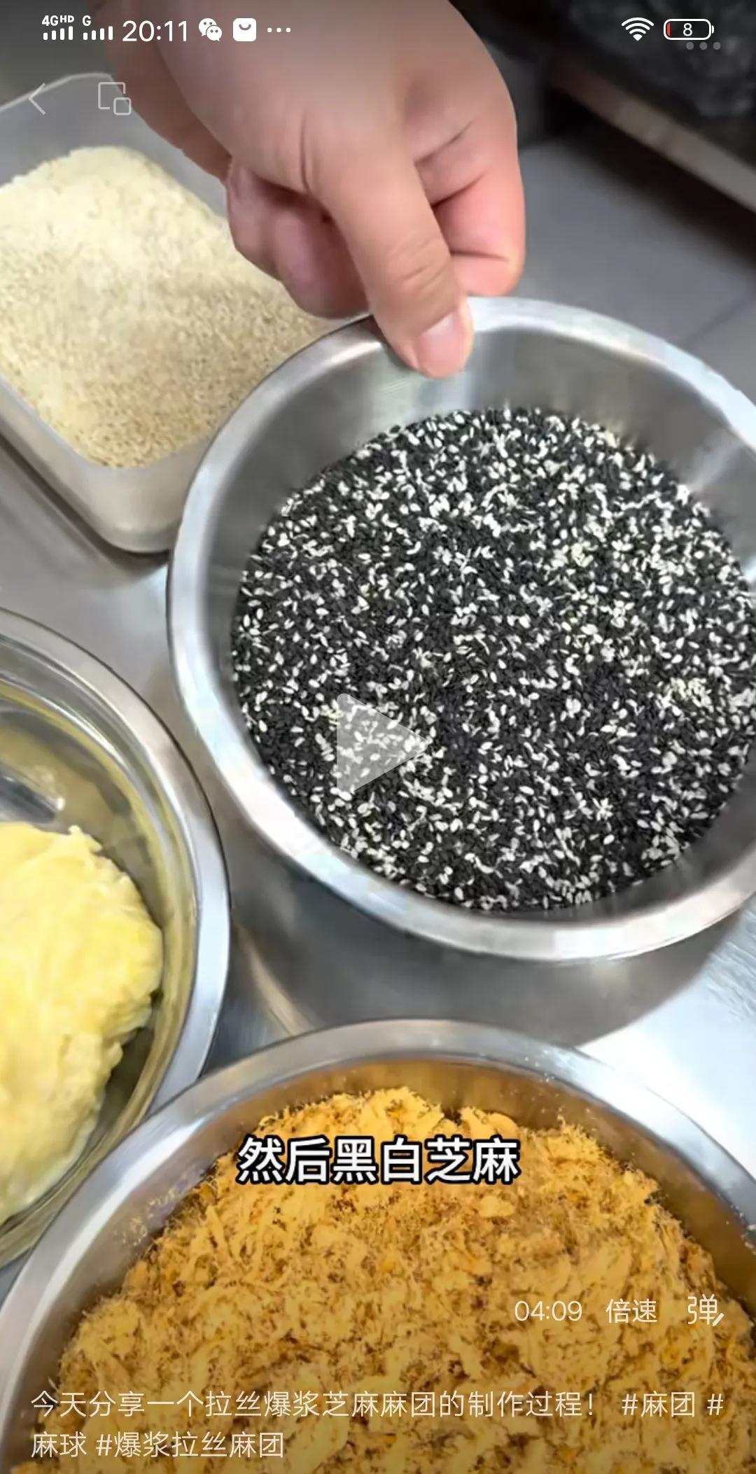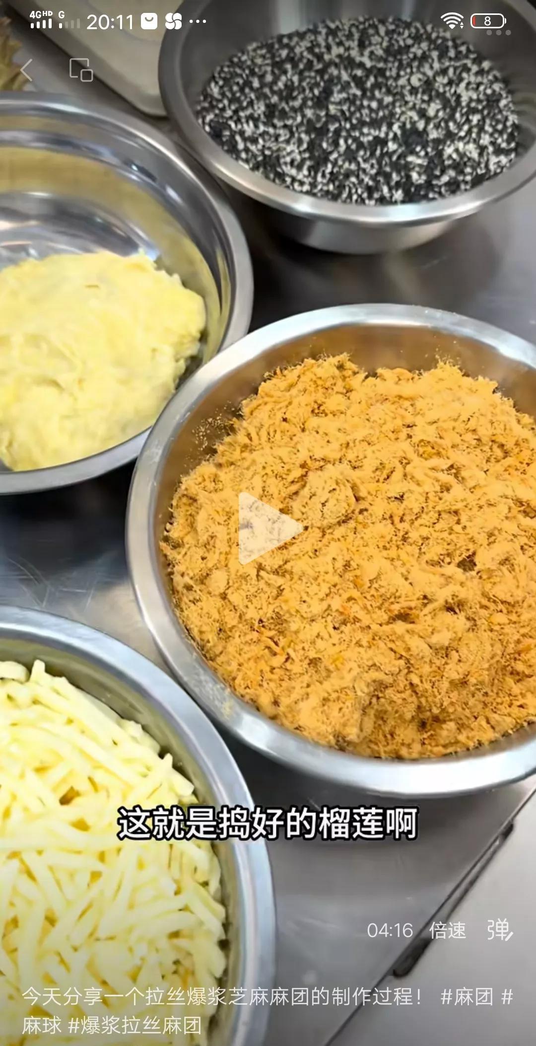 拉丝爆浆芝麻麻团制作 1.和面 往和面盆里放5克精盐,15克绵白糖,米粉750克,放入750克煮熟的南瓜(米粉、南瓜比1:1),和面,和好面后,在分成60克大小均匀的剂子。 2.制作馅料 馅料根据爱好可以是芝士碎、哈密瓜的(煮熟捣成泥)、玉米粒(煮熟)、紫薯(蒸熟捣成泥)、紫米(蒸熟)、红豆馅(蒸熟捣成泥)、肉松、捣好的榴莲、黑白芝麻。馅料可根据自己爱好随意搭配, 3.制作麻团 把剂子压成薄片,放入适量馅料,往上收,裹住馅料,团成球状。再再黑白芝麻里滚动,按压麻团,使芝麻嵌进麻团表面。然后裹上芝士。 4.炸麻团 炸麻团油温不能太高,150度即可,油温100度时,把麻团放入小罩慢慢下锅,等表面稍微带点硬壳,我们在里面稍微搅动一下,炸制大约10分钟,表面焦黄即可。