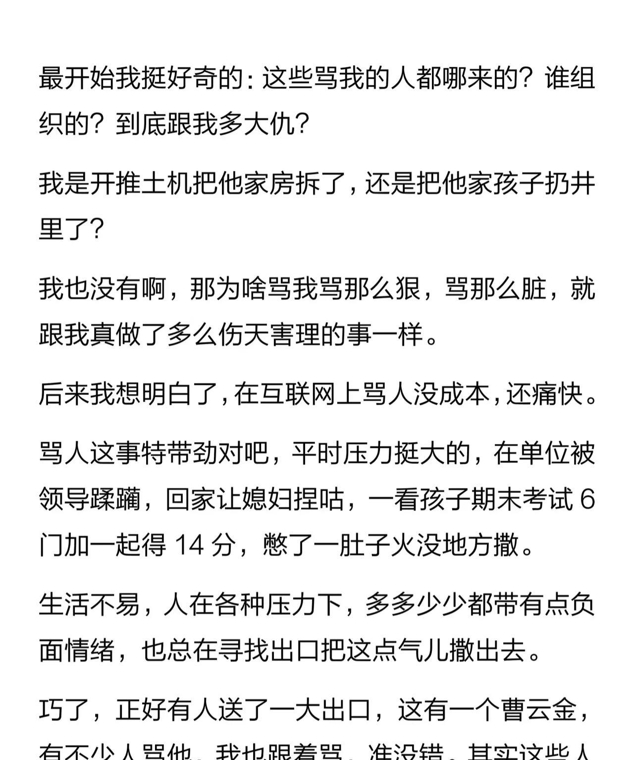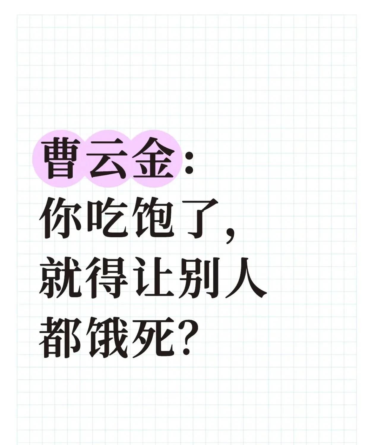 曹云金成功“洗白”自己? 洗白什么,当街打人,还是孩子没满周岁,就离婚,给前妻五百万,说是一次性买断的抚养费。 看看标题,曹云金:你吃饱了,就得别人都饿死吗?在说谁,自己吗,开启直播赛道800天,线上线下说了将近700段相声,有一个火遍全网的代表作吗,100,200,300的全国商演,你给当地的小园子留饭了吗? 如果只看曹云金会觉得,说的不错,但是你如果看过郭老师采访就知道,曹云金说的都是郭老师说过的话,你起来总结的吗,一直在模仿从未有过超越。 曹班主你如果只说自己直播的成绩,带货成绩,自己的商演,纲丝也不会看不起你,但你直播,商演有一次不提德云社,不提郭老师的吗,这就是你的流量密码对吧。 洗白,怎么洗,你在德云社最难的时候离开,还要带走能上台的演员,然后说自己是被逼走的,说大闹郭老师生日宴,是为了涨工资,公司都快倒闭了,你提涨工资,以表忠心吗? 曹班主,你也带着100多号班子全国演出了,容易吗,扪心自问,如果有一个和你一样狂的人,你怎么处理。 不用再提师承了,郭老师说了,自从德云家谱公布那天,这件事就不会再提了。#曹云金成功洗白自己?# #曹云金# #曹云金:你吃饱了,别人就得饿死吗#