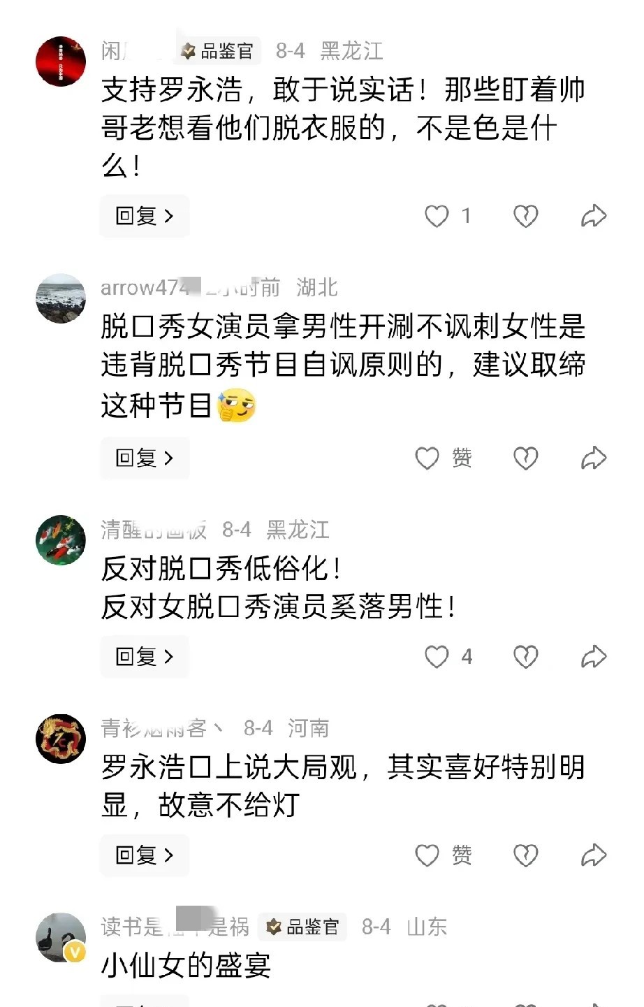 女性脱口秀的雷最终还是爆了, 只不过是被罗永浩与素人微博骂战引爆。 女性脱口秀演员现在是越来越疯癫, 从骂男友骂丈夫再到父亲, 到最后蹲厕所都要被调侃, 直到观众喊出让庞博代替张绍刚和他的时候彻底破防, 回想当初李诞和罗永浩算是国内初代脱口秀祖师爷, 如今一个破口大骂,一个关闭评论, 是不是很可笑, 当初两个站着看戏坚定支持杨笠的人, 如今被回旋镖扎的体无完肤, 不过罗永浩这次连发十几条微博骂网友确实做得不对, 知道你这人嘴巴毒, 但是全部是污言秽语确实不合适, 这回好了被长期享受的女权主义者抓到机会用视频文字钉在耻辱柱上下不来台。 如今的社会女权主义造就了太多的女权师, 不是说短期可以改变的, 相信罗永浩吃了这次大亏以后会老实, 毕竟一个欠了几个亿不跑还完钱的人也不会坏到哪去?你说是吧! 大家对罗永浩怒怼女权脱口秀网友怎么看? 欢迎评论区点赞留言讨论。