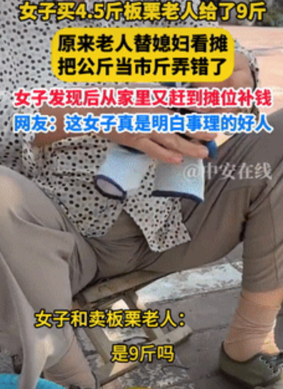 是个讲究人!安徽六安,一女子看到有老人卖板栗,过去买了4.5斤的,可到家后却发现老人竟给了9斤,而女子接下来的做法,也值得称赞,网友:这女子真是位明事理的好人! 据中安在线8月5日的报道,女子准备回家的时候,看到路边有个老人摆摊卖2板栗,于是就过去买了几斤的。 当老人称好东西后,她就付钱掂着袋子离开了,可走在路上时,却觉得这个重量好像有些问题。 倒不是有些轻,相反还感到挺重的,她心里就猜测会不会老人给多了,刚好马上就要到家了,她就回去自己重新称了下,结果就发现老人竟然多装了一倍的量。 随后她就赶紧折返回去,将情况告知给了老人,并主动将钱给补上,而在检查完秤后,女子也明白了这是怎么一回事。 原来是老人误把公斤当成市斤来算了,在聊天的过程中,也得知本来是儿媳摆摊买的,因为她有些事情,所以老人就先顶上了。 又因为她不熟悉秤,所以就出现了这种情况,也幸好是遇到了女子,要是换做其他人,保不齐就会占这个便宜了。 本来摆摊都挣不了多少的钱,要是以这种公斤当市斤来卖的话,这一天下来估计都要赔本了。 希望老人能够引以为戒吧,以后不敢再出现这种问题,毕竟人人可并非都想女子这样,能主动回来把钱补上,最后也为女子的做法点个赞。