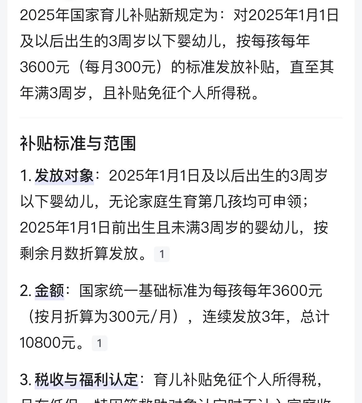 央妈真的着急起来了,开始全面行动,大力倡导生育,诚意十足! 从育儿补贴到幼儿园学费减免,国家在鼓励生育方面,确实是煞费苦心,每一项举措,都是货真价实的惠民政策。先来说育儿补贴,自2025年1月1日起,只要是符合规定生育的3周岁以下婴幼儿,每年均可领取3600元补贴,直至年满3周岁。这笔钱直接减轻了家庭在孩子幼儿时期的经济负担,奶粉、尿不湿等婴幼儿日常花销,都能由补贴分担一部分。并且,不论是一孩、二孩还是三孩家庭,都能够享受,真正实现了公平普惠。2025年前出生但未满3周岁的宝宝,也没有被遗漏,按照应补贴月数折算计发补贴,充分顾及到了不同家庭的实际状况。 再谈谈幼儿园免除一年学杂费的政策,从2025年秋季学期开始,公办幼儿园学前一年在园儿童的保育教育费全部免除。在民办幼儿园就读的孩子,也参照同类型公办园的免除水平相应减免。这样一来,家庭在孩子学前教育方面的支出就大幅减少了。要知道,学前教育费用原本就是许多家庭的一大笔开支,这一减免,能节省不少钱。对家长来说,实实在在地减轻了经济压力,也让更多家庭有信心去考虑生育。
