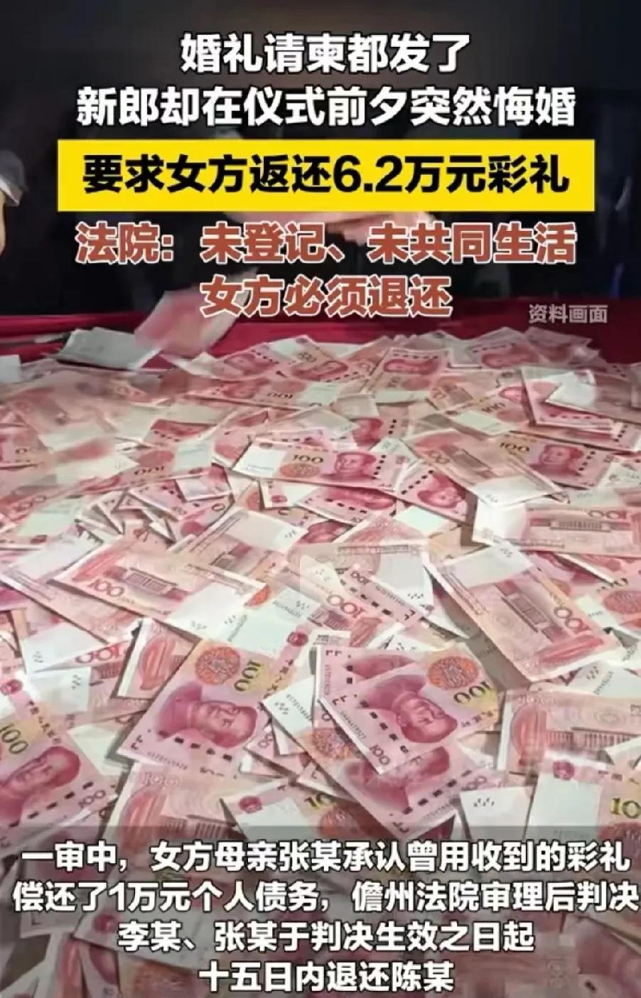 海南,女子把请柬都发出去了,不料,婚礼前夕男方突然悔婚,还要求女子返还6.2万元彩礼。女子退还了1万元后,不再归还剩余部分,表示剩余的彩礼都用于置办婚礼开销,而且男方的行为让她觉得丢尽了脸面,应当给她赔偿精神损失费。双方争执不下,闹上法庭,法院这样判! 8月5日,据极目新闻报道,男子婚礼前夕突然悔婚,还要求女方退还6.2万彩礼,却遭到女方拒绝。 陈先生和李女士即将步入婚姻殿堂,请柬都发出去了,可谁能想到,婚礼前夕却风云突变,闹得不可开交。 陈先生这一举动让李女士丢尽了脸面,真想找个地缝钻进去,她仿佛成为了亲朋好友眼中的笑柄。 2022年春节,经人热心介绍,陈先生和李女士相识了。 初次见面,两人都觉得对方还不错,一来二去,便开始交往起来。 那时候,他们心里都满是对未来生活的憧憬,想着说不定很快就能组建一个幸福的小家庭。 同年11月,双方家长坐到了一起,热热闹闹地协商起他们的结婚事宜。 陈先生也是诚意满满,同意向李女士及其母亲张女士支付6.2万元彩礼。之后,两人满心欢喜地定下了当年12月18日举办婚礼,还开始紧锣密鼓地筹备起来。 万万没想到,随着婚礼筹备的推进,各种琐事像潮水一般涌来,矛盾也随之不断升级。 从结婚照选哪家拍、登记时间定在哪天……到婚礼置办得怎样等等,两人的意见越来越不合,争吵越来越多。 陈先生心里越来越委屈,他觉得这场婚姻好像是“父母包办”的,自己和李女士之间其实缺乏深厚的感情基础。 更为关键的是,陈先生觉得李女士对他态度也一直不冷不热的,这让他心里很不是滋味。 终于,在婚礼前夕,陈先生实在忍受不了,一咬牙提出了分手,还要求李女士返还那6.2万元彩礼。 李女士一开始倒也爽快,同意退钱,还在2022年12月24日退还了陈先生1万元。 可第二天,她就反悔了,她觉得家人为了这场婚礼忙前忙后,彩礼早就用在置办婚礼开销上了,还有一部分还了家里的债,哪还能退啊。 而且这是陈先生突然悔婚,这些办婚礼的损失就应该由陈先生来承担。 更何况,陈先生这样的做法,让她在亲朋好友面前丢尽了脸面,她还想要精神损失费呢,这笔彩礼说什么也不能退还。 陈先生追讨无果,只好一纸诉状将李女士和她母亲张女士告上了法庭。 法庭上,张女士承认用收到的彩礼偿还了1万元个人债务。 一审法院审理后,判决李女士和张女士在判决生效之日起十五日内退还陈先生的彩礼5.2万元。 李女士和张女士哪能服气,立马提起上诉,还要求陈先生赔偿李女士的精神损失费5万元和误工费6000元。 二审法院经过详细调查,查明陈先生确实给了李女士6.2万元彩礼。可收了彩礼后,两人既没登记结婚,也没共同生活,张女士还把彩礼拿去还债和开销了。 依据《民法典》婚姻家庭编的司法解释规定:当事人请求返还按照习俗给付的彩礼的,如果查明属于以下情形,人民法院应当予以支持: (一)双方未办理结婚登记手续;(二)双方办理结婚登记手续但确未共同生活……。 陈先生与李女士虽已按习俗支付彩礼并筹备婚礼,但双方既未办理结婚登记,也未共同生活,符合返还彩礼的法定情形。 陈先生给付彩礼的直接目的是缔结婚姻关系,张女士将部分彩礼用于偿还个人债务及婚礼开销的行为,属于单方面处置财产,且无法证明该支出与婚姻目的直接相关。 李女士主张陈先生赔偿精神损失费5万元及误工费6000元,但未能提供证据证明陈先生存在过错行为或其精神损害达到“严重”程度。 误工费的主张同样缺乏依据。李女士未提供因筹备婚礼导致收入减少的证明,且误工费通常适用于人身损害赔偿场景,与彩礼纠纷无关。 综上,二审法院认为,李女士应当退还彩礼,除已退还的1万元,判决李女士退还剩下的5.2万元彩礼。 至于李女士主张陈先生悔婚在前,彩礼已花光不应退,还有让陈先生赔偿误工费和精神损失费,都缺乏事实和法律依据,法院不予支持。 对于李女士的遭遇,大家有什么看法呢?欢迎留言讨论。 关注@亚伟说法 ,多学法律,少走弯路!