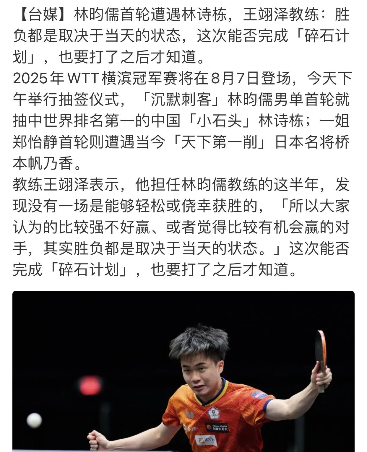 林昀儒又碰林诗栋!湾林教练这样说! 有意思的一幕发生了!当抽到林昀儒与林诗栋那一刹那,大迪和伊藤美诚快笑抽了! 抽签后林昀儒教练这样说:胜负取决于当天两个人的状态,这次能否完成“碎石计划”,要打完之后才知道。 为啥是“碎石计划”呢?三年的两人全部交手,林昀儒无一胜利! 这俩人在乒超没碰上,到横滨第一场就碰到,也真是应了那句“想躲也躲不掉”!两个人是明天晚上18.15比赛,我们一起期待吧