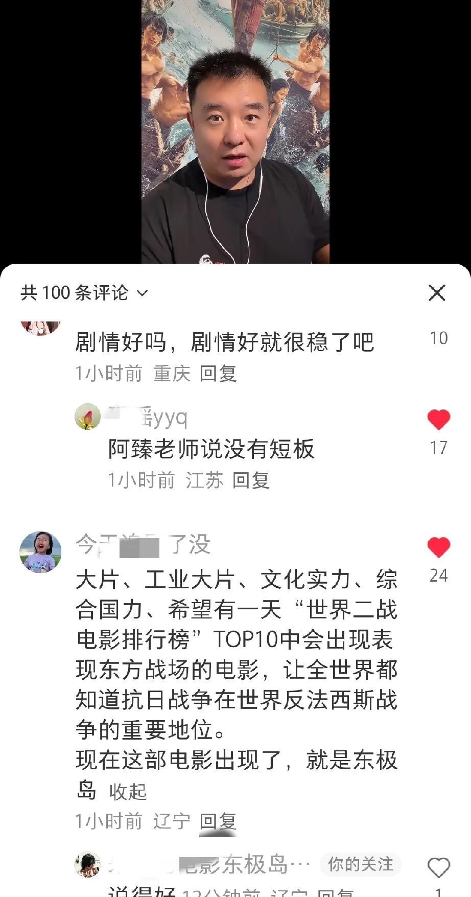 阿甄老师昨天看了《东极岛》首映礼,人刚出影院就迫不及待站在海报前催促大家快去买票,他说非常值得一看。他的视频一刀没剪就在那儿说自己看了的感受。全是真情实感,一顿夸,真正的工业巨制大片,史无前例海难片。最后总结一句:没有任何短板。 他的视频下有条评论也很抓人心,她说:这部电影讲的就是:起来,不愿做奴隶的人们。确实,这就是《东极岛》讲的重点。中国人善良但不能总忍受无辜枪杀,奋起反杀才是中国人骨子里的天性。 我放心了,阿甄老师情绪激动的点评让我相信《东极岛》真的会爆。他可不是阿谀奉承的人,我看过他很多点评,好就是好,不好就是不好。他不会讨好谁,不怕被谁骂,他说的都是自己的真情实感。