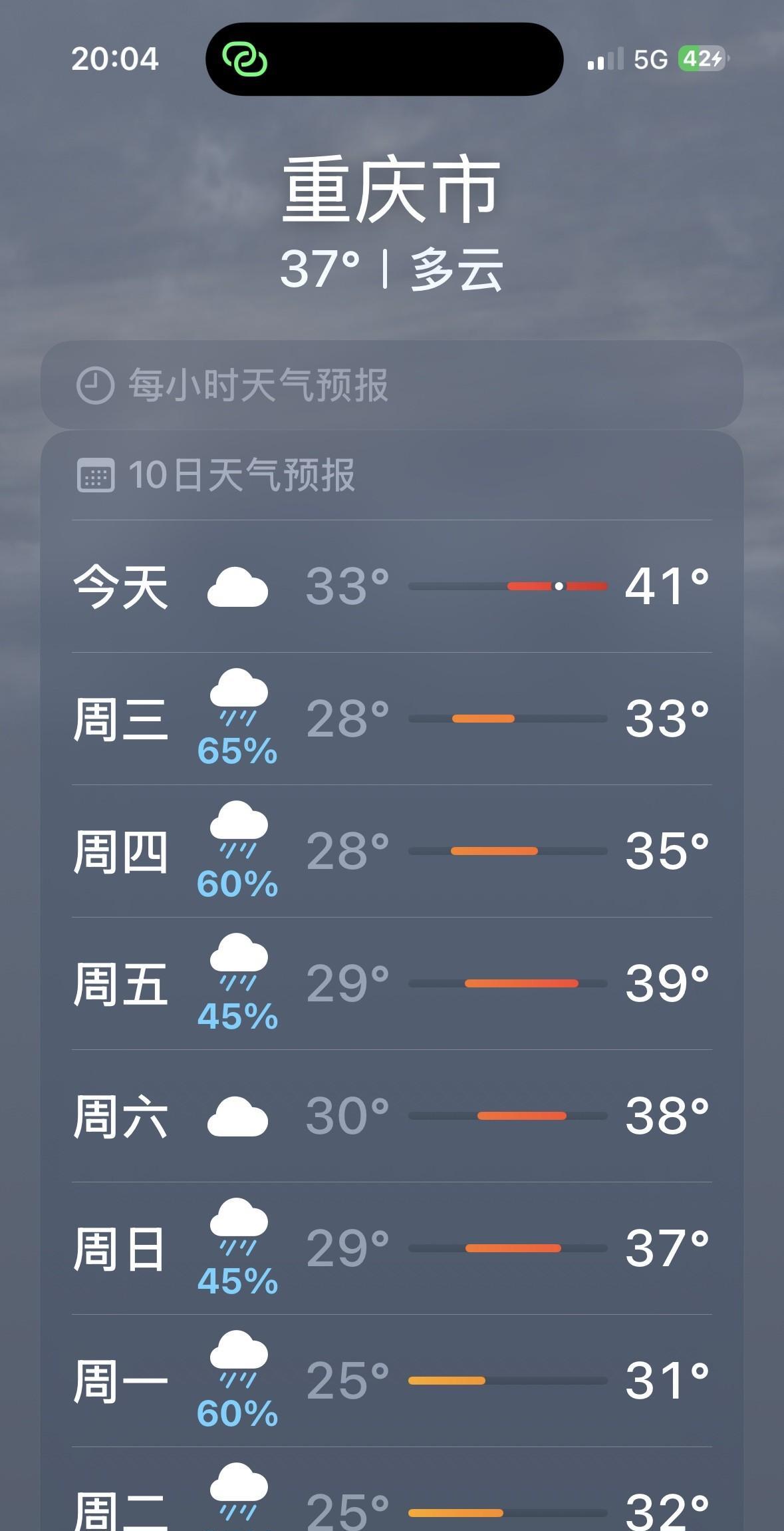 重庆人太惨了!好不容易盼来降雨降温,但是,8月6日到10日,重庆主城区,最高气温38度……超级闷热!重庆人,不怕43度的大太阳暴晒高温,就怕这种浑浊的天空的38度高温……啊啊啊!重庆人,太惨了! 好在,8月11日,星期一,重庆主城区,大雨转小雨,气温25-30度。 8月12日,星期二,重庆主城区,雨转阴,气温26-32度。 这周末,8月10日,星期天,重庆小雨转中雨,也不适合去仙女山、金佛山、四面山避暑旅游,不适合漂流,不适合玩水!#光线摄影世界曾兰谈天说地# #头号创作者激励计划#