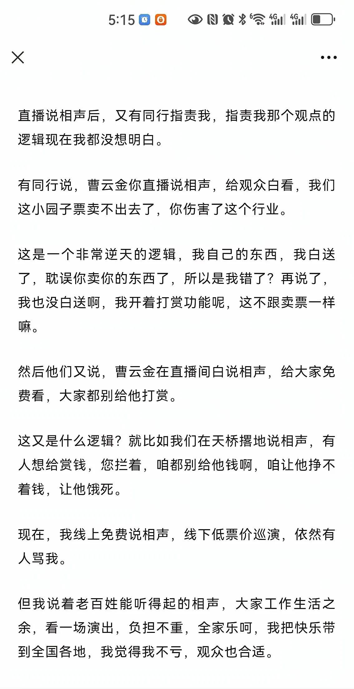 曹云金掏心窝的话,主动提到郭德纲 1.原来叫姐夫,后来叫师父,现在叫老师 2.郭老师教了艺术,还教做人,包括这15年,还在教做人,可以不是朋友,也没必要是敌人 3.咱不能我吃饱了,就得让别人没饭吃 4.直播赛道上,800多天说了700多段相声,不知道是不是力压郭老师的600多段。。 5.我碰到的老先生都不说闲话,都想把艺术搞好,没闲功夫嚼舌头。。。