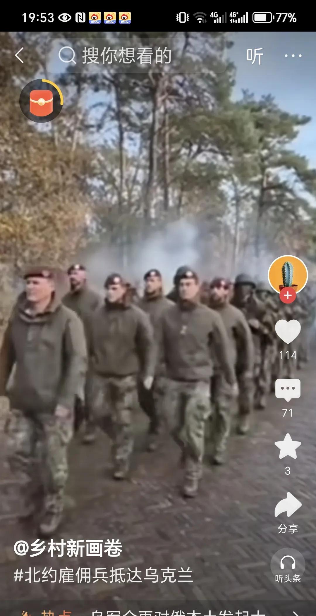乌克兰总统泽连斯基笑了, 刚刚看新闻, 近期北约雇佣兵, 大量涌入乌克兰, 协助乌克兰抵抗俄罗斯进攻。 据说人数已经达到一万多人了 从视频中可以看到, 这些北约雇佣兵确实看着装备精良, 而且个个士气高昂。 毕竟这些来自北约的雇佣兵有的曾在叙利亚、伊拉克、利比亚、阿富汗, 经过多年战斗, 富有战斗经验。 他们会使用热成像仪、夜视仪等各种高精尖美西方国家设备。 而且对操纵无人机也非常熟悉, 可以给俄罗斯军队造成重大伤害。 并且乌克兰给这些北约雇佣兵待遇也非常高, 一个月高达 1 万美元, 相当于人民币 7 万。 而且这些北约雇佣兵许多在乌克兰军队中担任教官, 他们住在高级宾馆, 有优厚的医疗保障。 这也是我们经常看到俄军袭击乌克兰高级宾馆, 的原因, 最主要是这些高级宾馆住着来自北约的雇佣兵。 难怪这段时间乌克兰总统泽连斯基说话话越来越硬气, 腰杆子也挺起来了。