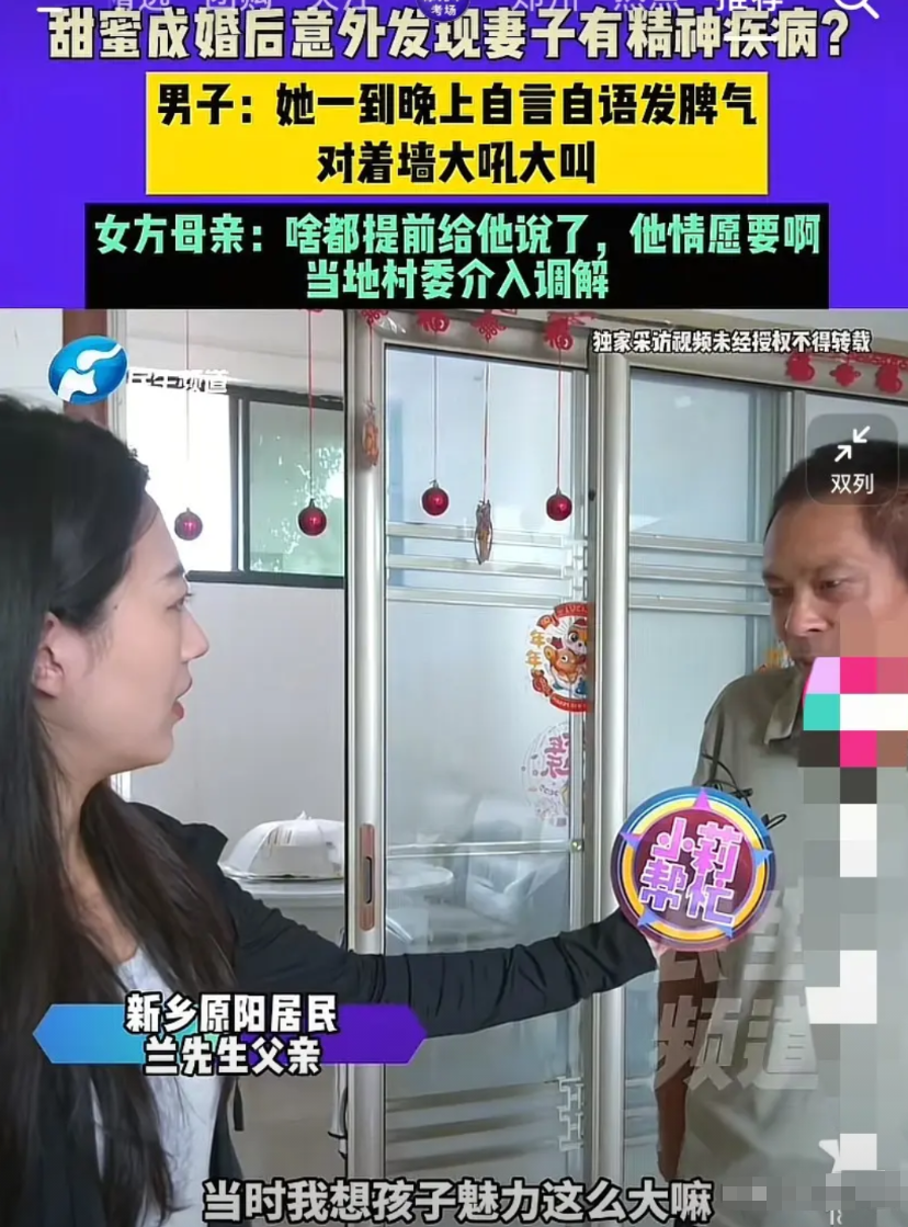 河南新乡,35岁男子经媒人介绍认识了一名比自己大3岁的二婚女子,刚认识对方不到一个月,对方父母就催着结婚。男子起初还以为是自己魅力大,结果给了对方10万余元彩礼,与对方结完婚后,发现对方一到晚上就自言自语发脾气,对着墙大吼大叫。