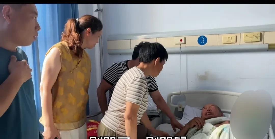 华强一家三口带着礼品来医院看望鹏爸。 倔婆婆走到病床前,关切地询问鹏爸中午吃饭了