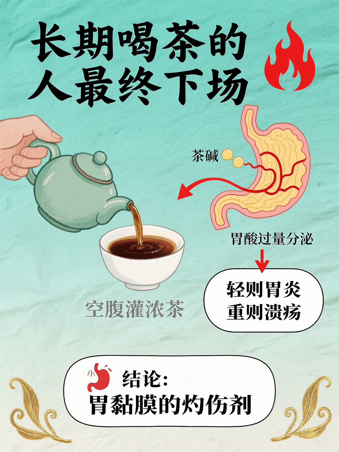 4.胃黏膜的灼伤剂:一问都是空腹灌浓茶!茶碱刺激胃酸过量分泌,轻则胃炎,重则溃疡。