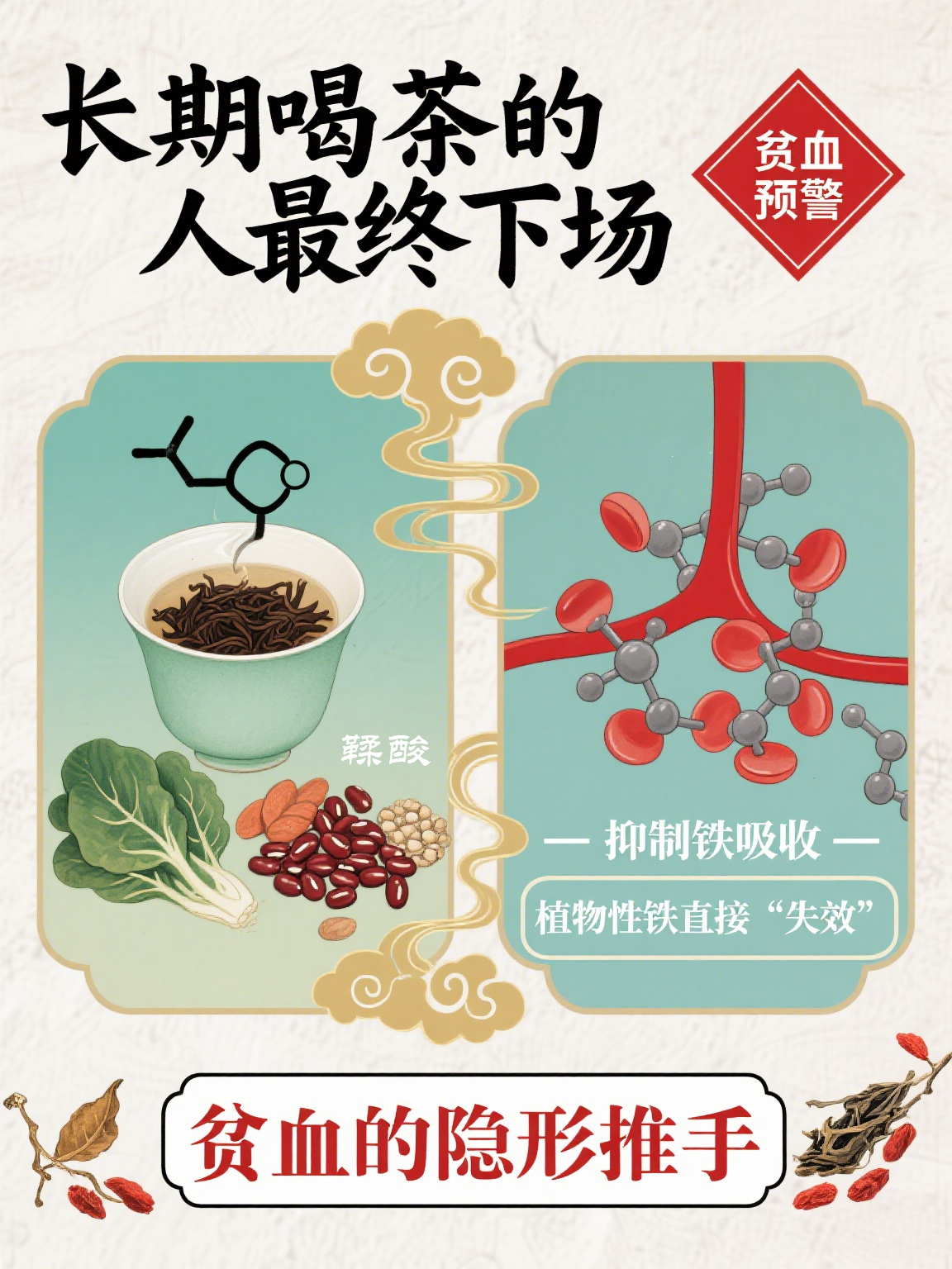 2.贫血的隐形推手:长沙某65岁老人晕倒送医,确诊重度缺铁性贫血——元凶是“半杯茶叶半杯水” 的喝茶习惯。茶叶中鞣酸强力抑制铁吸收,尤其植物性铁(如菠菜、红豆)在体内直接“失效”。