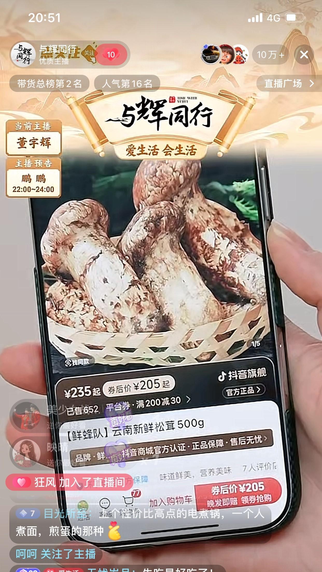 终于卖了款高价初级农产品是什么体验? 彪哥这周周二就上播了! 幸福来的有点突然! 感觉都有点不适应了! 这不上了个了“菌子”给宇辉卖! 还细心的切了片,摆了盘! 宇辉吃起来津津有味的! 开始喊话云南的朋友 问是不是价格高的才叫“菌子”! 一般的菌类捞不着叫这个名! 有网友问什么味道, 他一边品尝一边回答! 结果讲到价格,一下子惊掉下巴! 最便宜的一斤也是200多元! 大的那款一斤还要400多元! 这价格!恐怕是彪哥直播这么多年来遇到的 初级农产品天花板了吧! 宇辉笑着说,我刚才这得吃了几十块吧! 屏幕外的马骞听了哈哈大笑! 屏幕里有网友直接说,你这吃了上百元了吧! 到这里,宇辉就停下来了 看来这么贵的好东西彪哥是不想自己吃独食! 这是妥妥想给同事小伙伴们留一下 大家都好尝尝! 松茸菌菇真的是好东西, 也不容易买到, 宇辉这是努力做到货盘丰俭由人, 好的初级农产品能进入直播间也是难得! 那近千名买这个菌子的朋友 就像宇辉说的 那得是住大别墅或者大平层的朋友! 你说是不是?