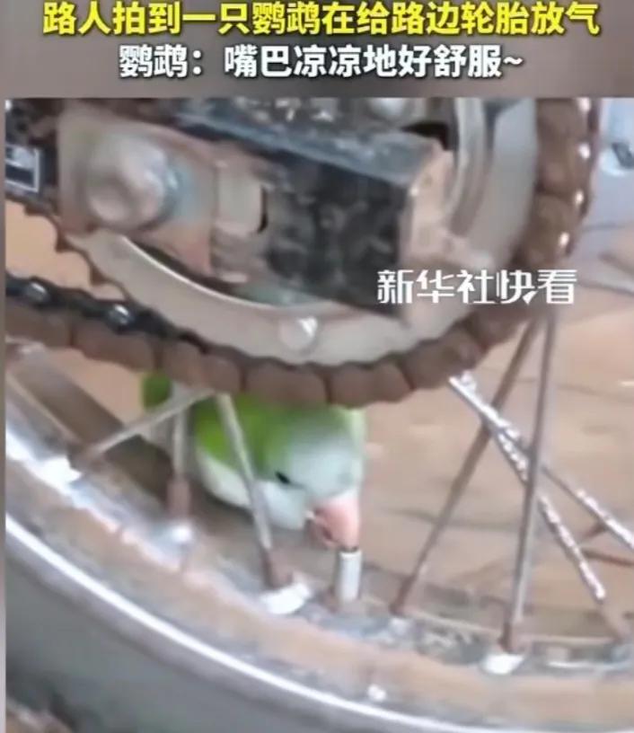 一只鹦鹉飞到停在路边的自行车旁,用嘴去啄自行车轮胎的气门芯,顿时轮胎气门发出“嘶嘶”的放气声,鹦鹉听到放气声,啄的更带劲了。