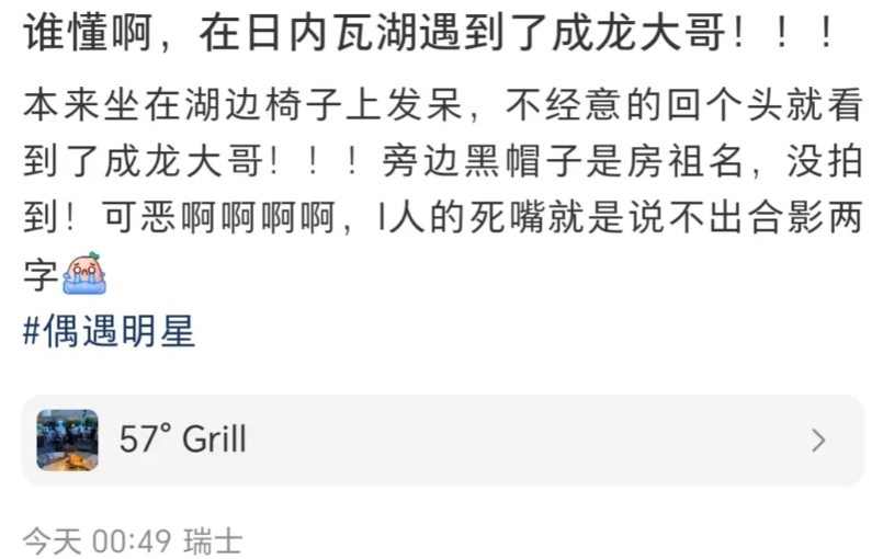 71岁成龙和42岁儿子房祖名在瑞士被偶遇,这是时隔多年后父子俩的罕见同框画面。 据网友讲述,当时其在日内瓦湖边上打发时间,突然看到了成龙,还有房祖名。不过,时机转眼即逝,网友没有拍到房祖名的正面照,也很遗憾没有要到父子俩的合影。 据网友分享的照片,成龙状态极佳!虽然脸上布满了岁月的痕迹,胶原蛋白流失严重,但身材很好,看手臂就知道了,肌肉很多,一看平时就有严格的训练。 他边上有个戴黑帽子,穿黑上衣、黑裤子、黑鞋子的中年男子。虽然没有看到脸,但凭身形等特征可以确定是房祖名。 记得今年5月,有人分享过他的正面照片。今年1月,也有人碰到他,并分享了一张背影照。这两张近照和上述网友分享的照片就是同一个人。 据了解,成龙这次瑞士之行是去领奖的。那是什么奖呢?第78届瑞士洛迦迪国际电影节终身成就奖。这是他在奥斯卡金像奖终身成就奖后获得的又一项殊荣,太厉害了! 据了解,第78届瑞士洛迦迪国际电影节在这个月的6号开幕,持续到本月16号。在此,恭喜成龙大哥!