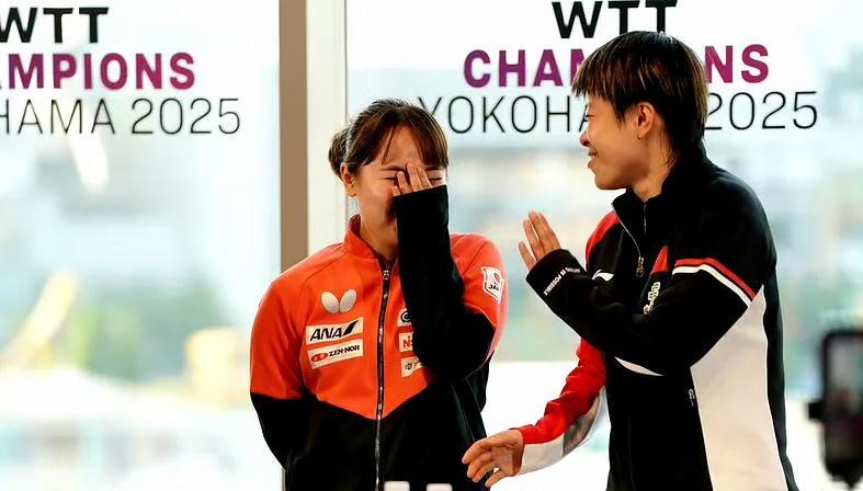 WTT横滨冠军赛抽签仪式上,王艺迪和伊藤美诚发现被抽在一起,两人乐不可支,和场上