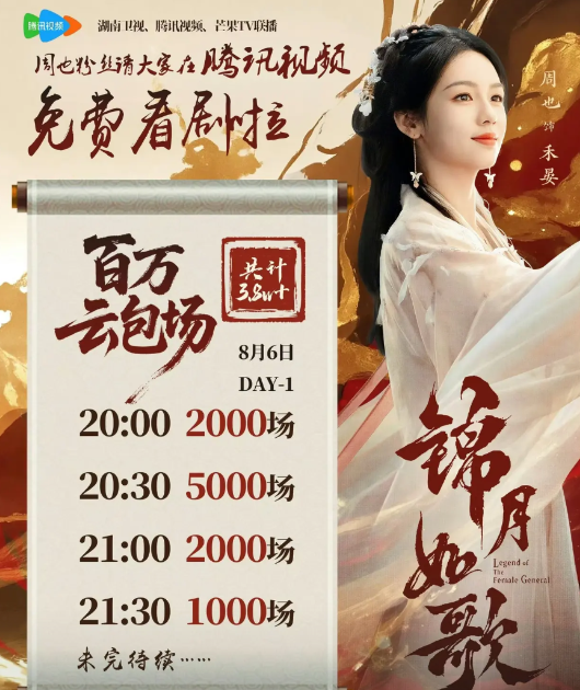 《锦月如歌》云包场来了,周也粉丝包了3.8w+场。 如果没看错的话男主家第一天总数还没女主家第一天第一轮多,估计是丞磊家是被前几天的预告和物料待遇恶心到了。 别的不多说,支持多包场的多拿红利,期待开播