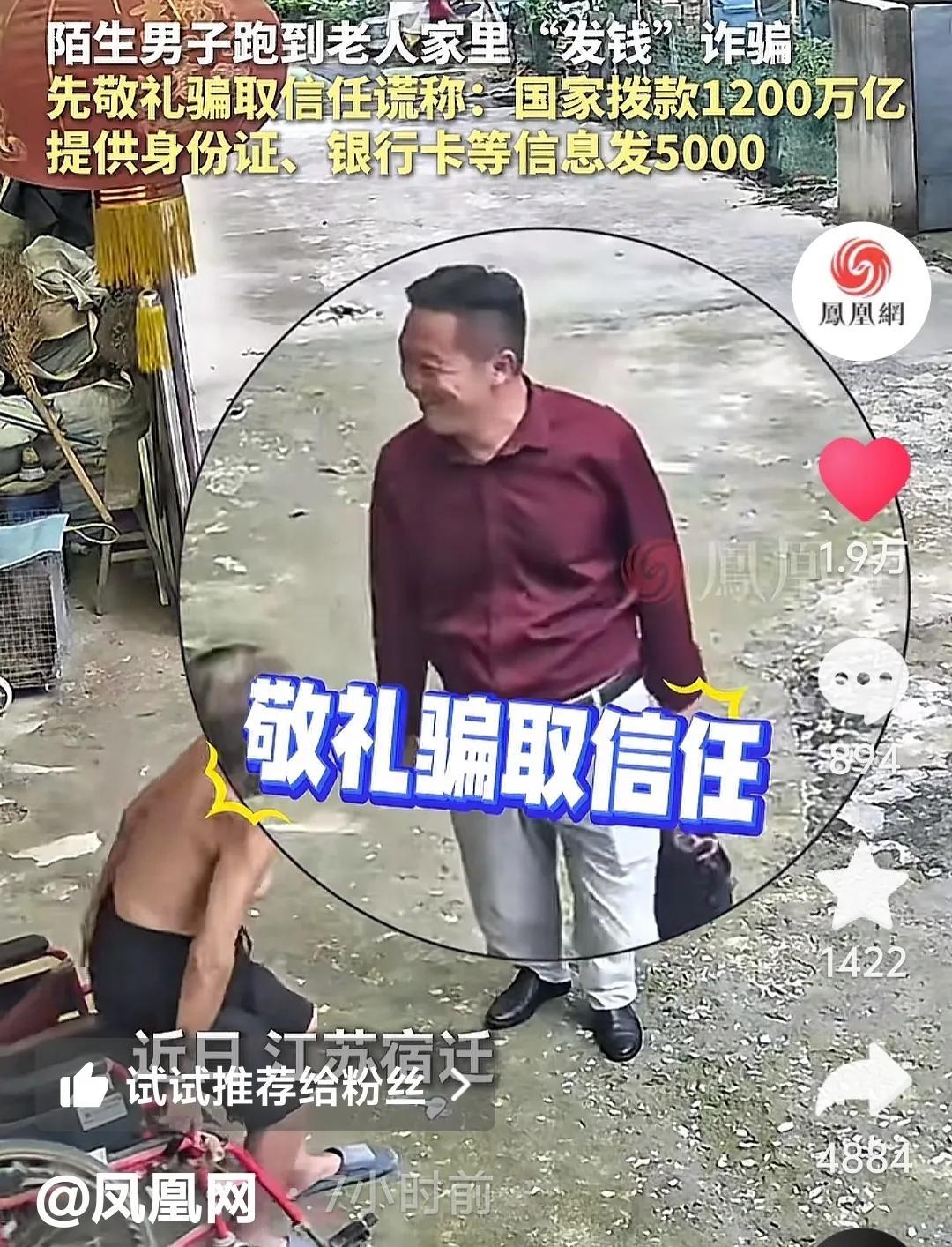 据报道,江苏宿迁8月2日发生了陌生男子以“国家拨款”名义诈骗老人事件,其事件经过如下: 一名西装革履的男子冒充国家工作人员,谎称“国家下拨1200万亿资金”,需为老人办理“困难家庭补助”,要求提供身份证、银行卡、手机号及智能手机,并强调“无需其他手续,直接上报国家”。男子通过敬礼、握手等行为降低老人警惕,甚至利用老人的善良(如邀请其进屋避太阳)实施欺骗。 老人儿子发现异常后,以“老人年事已高、无智能手机”为由将男子赶走,避免了信息泄露和财产损失。 截至8月5日,公开报道中未提及涉案男子被抓获的具体信息。警方已介入调查,并提醒公众提高警惕,如发现类似行为及时报警。 此类案件利用老年人对政策的不熟悉,以“扶贫补贴”“乡村振兴资金”为幌子,实际目的是套取个人信息用于洗钱或贷款。骗子常谎称“名额有限、需保密”,催促老人尽快提供信息。 警方防范建议: 1、“三不”原则:不提供身份证、银行卡、验证码;不转账;不轻信“天上掉馅饼”。 2、核实渠道:国家补贴通过社区或正规银行发放,不会上门办理。 3、紧急求助:遇可疑情况拨打反诈专线96110,或联系子女、社区工作人员。