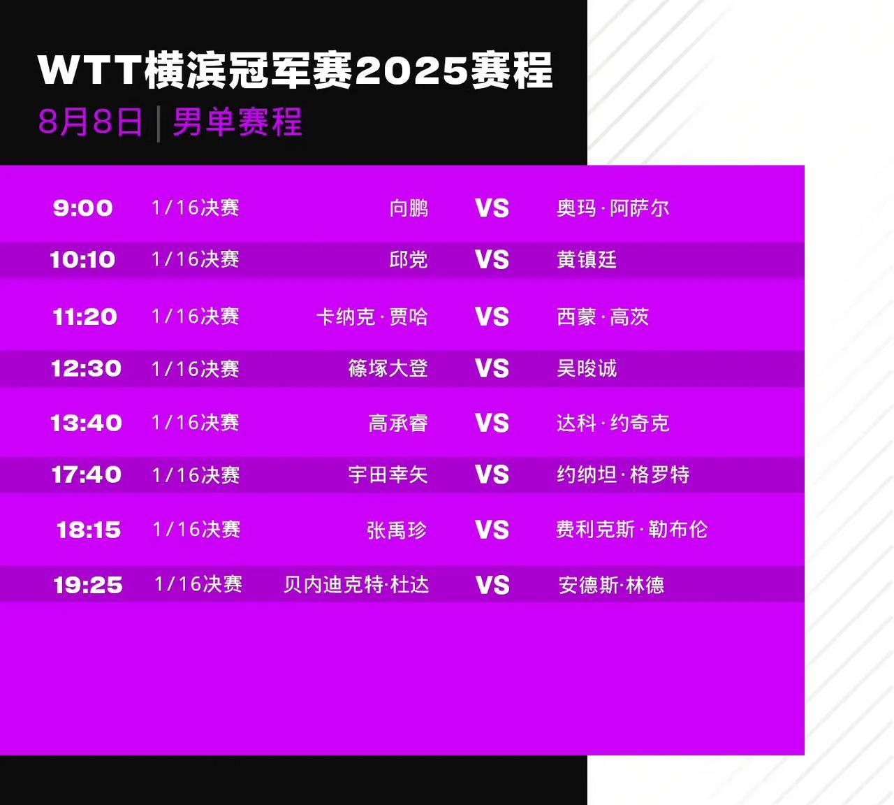 8月8日首轮比赛就很精彩,这次都是强强对决,内战还能第一天就上演。 陈垣宇VS王楚钦第一场就内战。 林诗栋VS林昀儒真的是遇见八次林昀儒输八次好惨一男种子。 向鹏和薛飞也是参加比赛,但是对手都是外协。 蒯曼,王艺迪,石洵瑶,陈幸同,王曼昱,孙颖莎,等女运动员也有比赛。 这次比赛都是强敌,每一场都不能掉以轻心。 不过从早上9:00—20:00都有比赛。不要错过精彩。