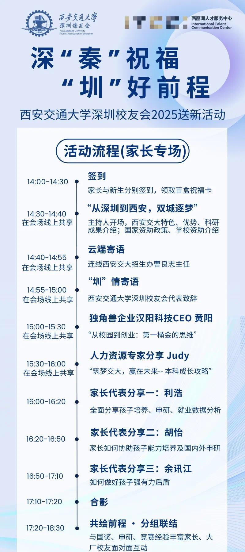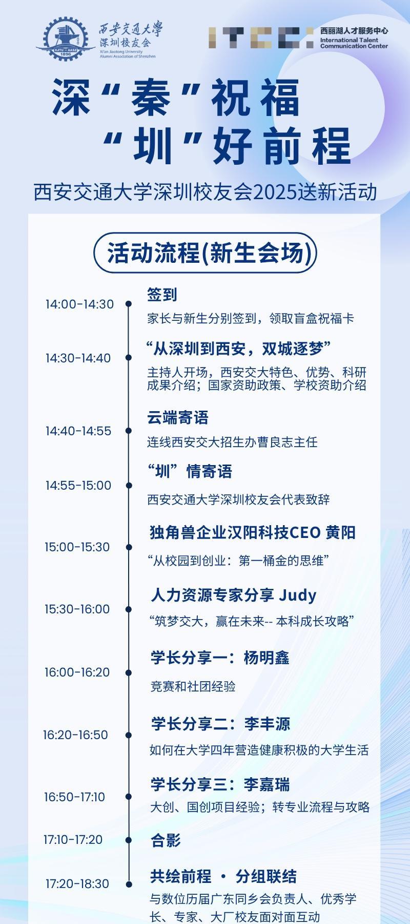 深“秦”祝福 “圳”好前程| 深圳校友会2025送新启动 2025年,母校西安交通大学在广东招生再创佳绩,硕果累累。广东省理科一流大学排名录取位次提升445位, 理科主代码208专业组录取位次由2024年的省排3031位(648分)提升到2586位(656分)。今年广东省招生258人,其中深圳招收64人。 时间:2025年8月10日(周日)14:30-18:30地点:深圳南山西丽湖人才服务中心 特为家长开设“如何协助新生适应大学生活家长专场”,邀请西安交通大学招生办主管牛元天老师、历届优秀毕业生家长胡怡(18级胡卓尔家长)、利浩(19级利友诚家长)、余汛江(21级余华威家长)、深圳人力资源专家为家长做专题分享。 每位新生随机抽取一位深圳校友的联络方式+手写祝福卡,建立 1V1深度联结。 全球唯一的庭院扫雪机器人企业,新晋独角兽企业创始人&CEO黄阳将莅临送新现场,为新生学弟学妹分享。 人力资源专家、2024年成功申研香港科技大学的吴宇超学长的妈妈分享《筑梦交大,赢在未来-- 西安交大本科成长攻略》,为同学们带来本科四年竞争力锻造手册。 西安交通大学23级信息工程专业,将从如何在大学四年营造健康积极的大学生活为新生分享。 西安交通大学2023级软件学院学长,原智能制造专业,于2024年通过转专业考试转入软件工程专业,对学校转专业模块的流程与细节有着充分了解,有充足的转专业考试备考经验,对有转专业意愿的同学有宝贵的经验指导意义。