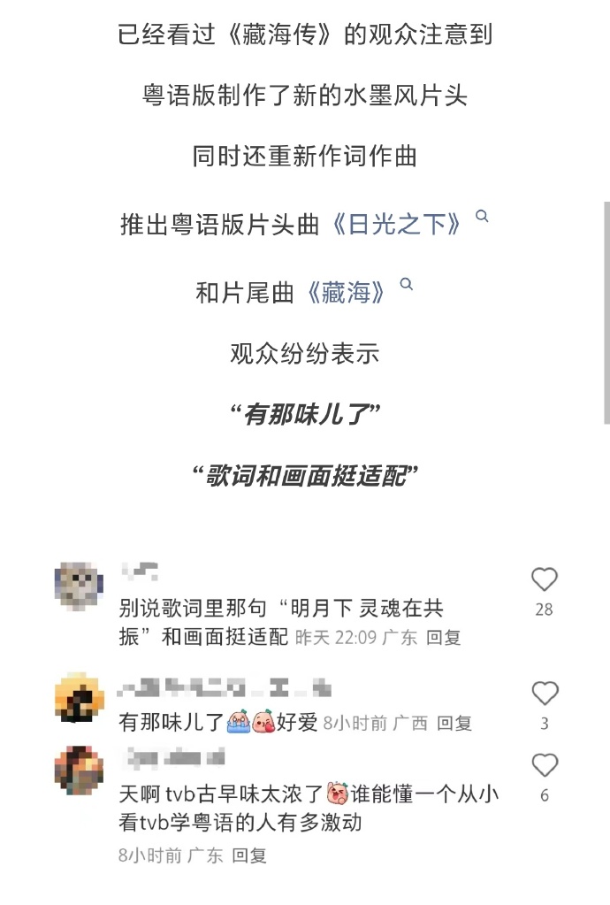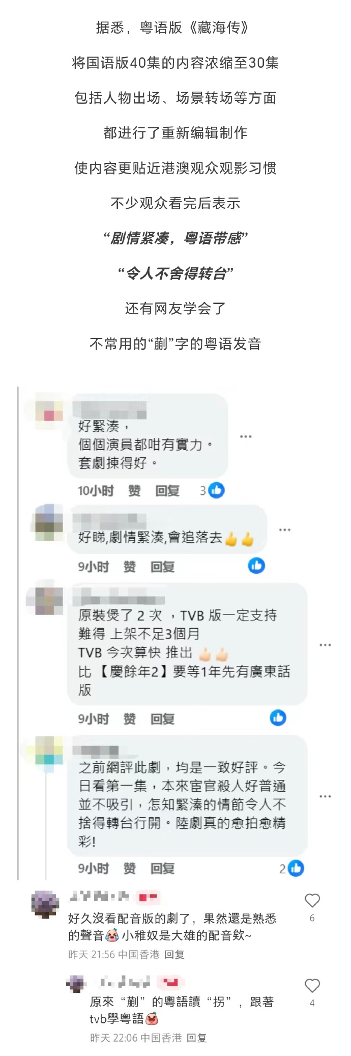 《藏海传》在TVB正式播出,人民日报,新华社等国家官媒连发7条预告,国剧之光的排面真是牛透了。同时人们惊喜地发现,TVB版的《藏海传》与我们看的完全不一样,不仅重新制作了水墨片头尾,还重新作词作曲推出粤语版片头曲《日光之下》片尾曲《藏海》,浓浓的水墨国风与粤语曲风完美契合,果然扎根华夏大地的乡音与这方山水永远同频共振,和谐无比。 更令人惊喜的是,TVB版将国语版40集的内容浓缩至30集,人物出场,场景转场等方面都重新编辑制作了,更贴近港澳观众观影习惯,经过一天的收看,观众普遍反映:剧情紧凑,粤语带感,令人不舍得转台。 有意思的是,稚奴的脆皮属性被剪掉,被疑魔童长生了,去当了TVB版的剪辑师,也是让人忍俊不禁。而更加紧凑的节奏,跌宕起伏的转折,更抓眼球,更有爽感,完全是不一样的新的体验,让人好想一睹为快啊。相信:往事藏在深海,山会改,国粹精华永存,精彩的传奇故事永远同情共感,扬我国剧之光!