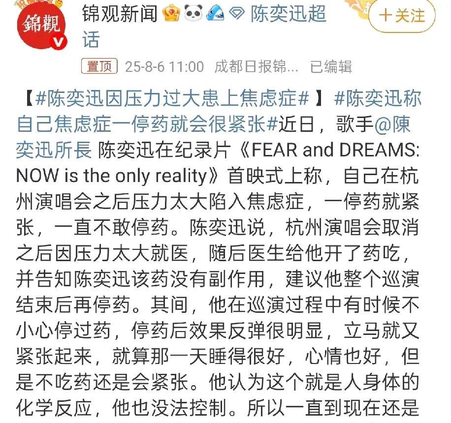 陈奕迅自曝自己因为开演唱会压力太大,患上了焦虑症,身体时刻处于紧绷焦虑的状态,非常的难受,去看医生,医生给他开了药,叮嘱他每天按时吃药,等巡演结束后再停药。 结果他只是不小心停了一次药,他的状态就很不对劲,陷入紧张难受的情绪中,对生活和工作的影响很大。 粉丝们看后都心疼坏了,让陈奕迅要学会放松,不要给自己太大的压力。 还有的网友猜测陈奕迅是不是感染了新冠后影响了交叉神经,要不然陈奕迅出道这么多年了,大大小小的演唱会开无数次了,怎么可能因为一个演唱会就压力大到患上了焦虑症呢? 小编觉得陈奕迅会患上焦虑症,是因为他太想做到完美了,对自己的要求高,又很急切的想要做好,又担心会发生什么不好的意外,各种情绪交织就让他变得很紧张,很焦虑,他应该在吃药治疗的同时,也要去做一做心理上的疏导了,完全可以休息一段时间,把自己从工作的状态抽离出来,看会不会好一些。#头号创作者激励计划#