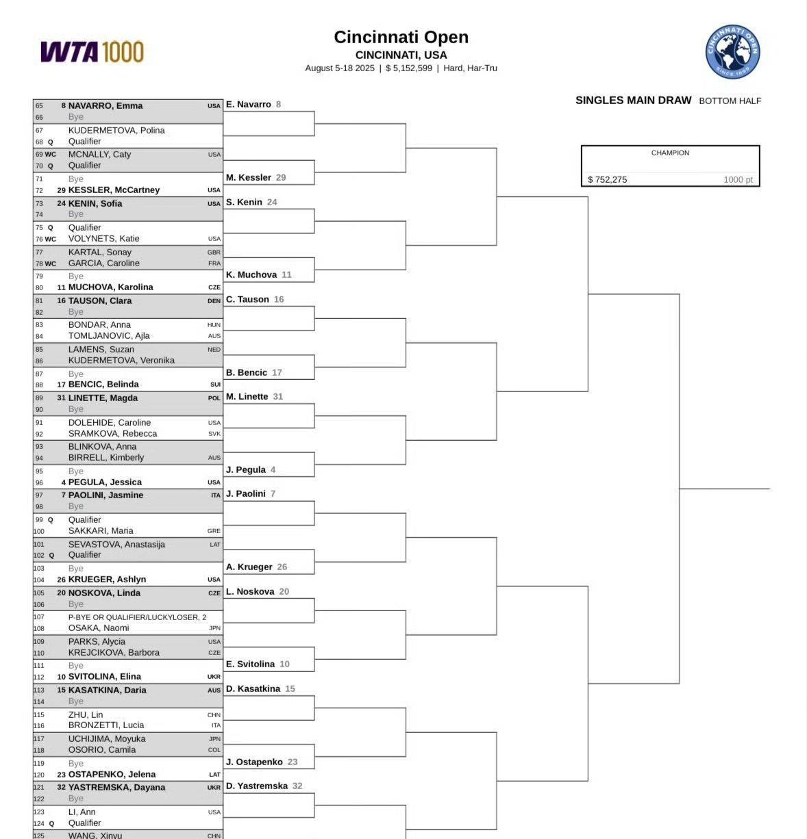 辛辛那提WTA1000正赛签表