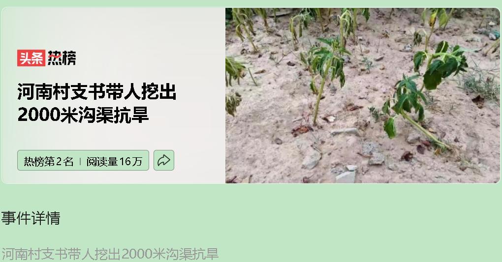 这位 98 年的年轻村支书,真是河南抗旱战场上的高光人物。他用铁锹和汗水告诉我们:不能干等着下雨,咱得自己引水!驻马店闫庄村的陈磊,领着村民五天五夜疏通 2000 米沟渠,把板桥水库的 “救命水” 送到 3000 亩农田。这效率,直接拉满。 为啥这事值得猛夸?痛点抓得准!水库放水,可沟渠年久失修,村民干着急。陈磊带队清淤,打通 “最后一公里”,把水精准引到地头,喷灌机、柴油机一用,旱地瞬间 “喝饱”。年轻干部不玩虚的,桥涵堵了机械进不去?党员干部跳进水里硬刨。这种 “我先上” 的劲儿,带动全村人一起干,凝聚力爆表。效果立竿见影,70 岁的张庭和老两口轻松浇了三遍地,玉米秆都挺直了腰。全村 90% 耕地浇上两遍水,在驻马店 163 万亩重旱区杀出一条生路。 背后问题更值得深思。水利欠账得补,村民打井得打到七八十米才见水,以前三四十米就行。专家说灌溉设施多是 “上世纪古董”,引水成本高、功能老化。极端天气成常态,河南 7 月平均气温破 64 年纪录,41% 站点达重旱。未来 “旱涝急转” 可能分分钟上演,光靠人扛太被动,水利网必须升级成 “智能抗灾系统”。 这位年轻支书这波操作,接地气又真解渴。可丰收不能总指望 “铁锹奇迹”,守护粮仓得靠 “未旱先通” 的硬实力。未来水利设施咋升级?智能抗灾系统又该如何打造?这些问题,值得我们继续深思。#河南村支书带人挖出2000米沟渠抗旱#