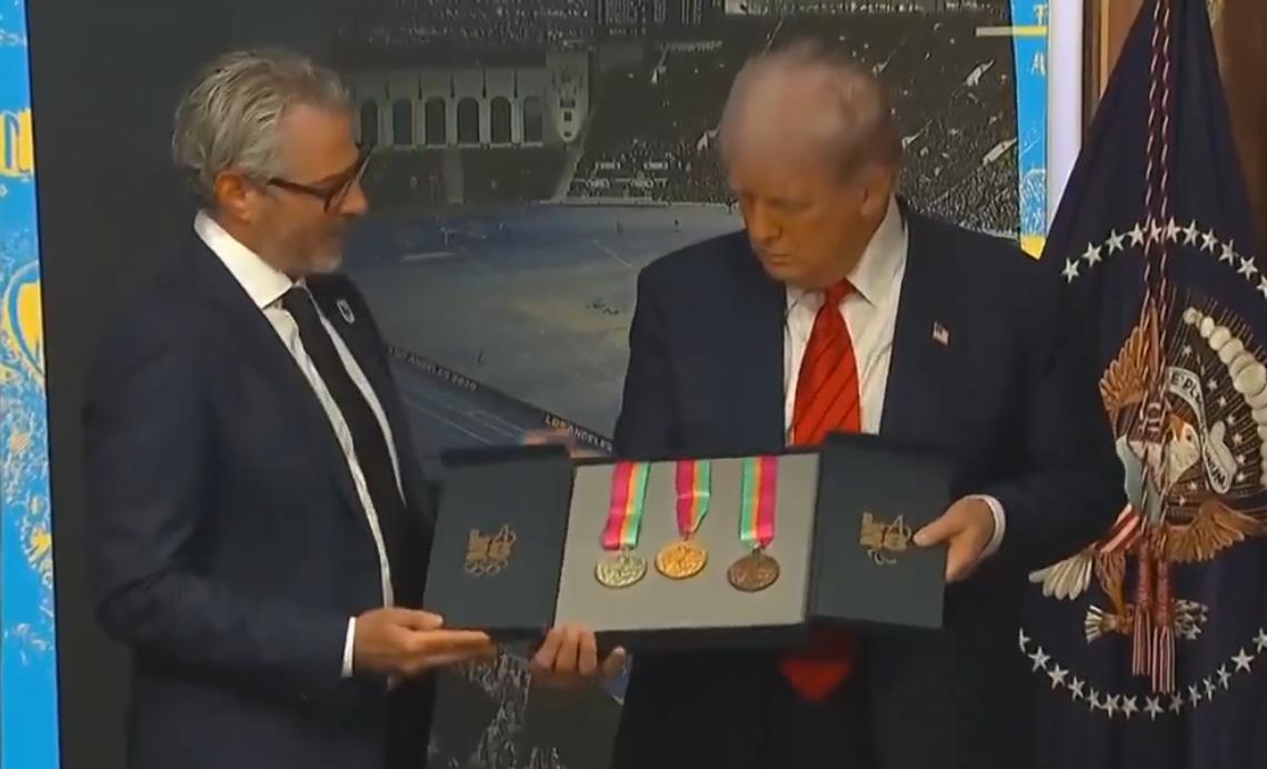 2028年洛杉矶奥运会主席向特朗普赠送1984年洛杉矶奥运会的原版奖牌,金银铜一