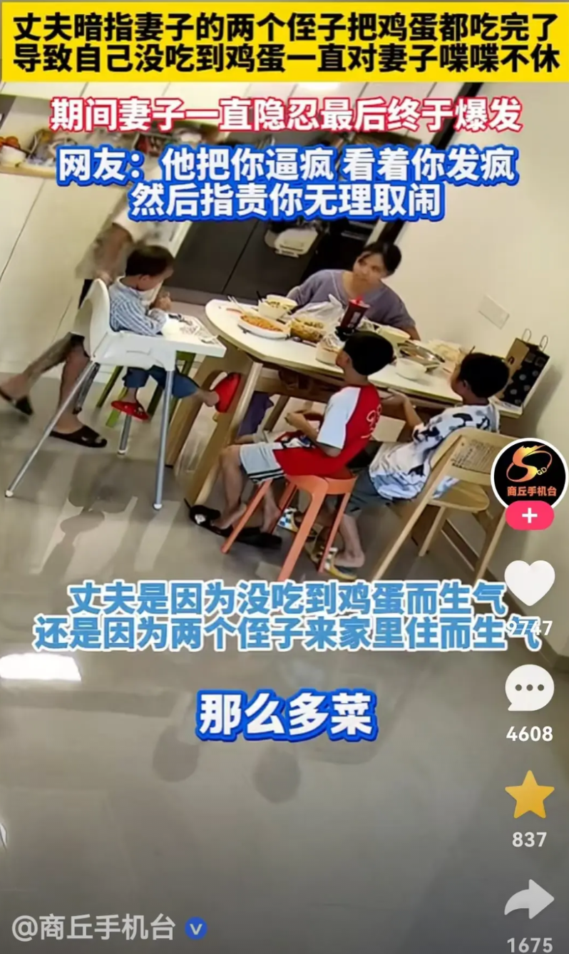 这样的婚姻太让人窒息!女子的两个侄子去她家玩,因为丈夫没吃到鸡蛋,就怒气冲冲指责