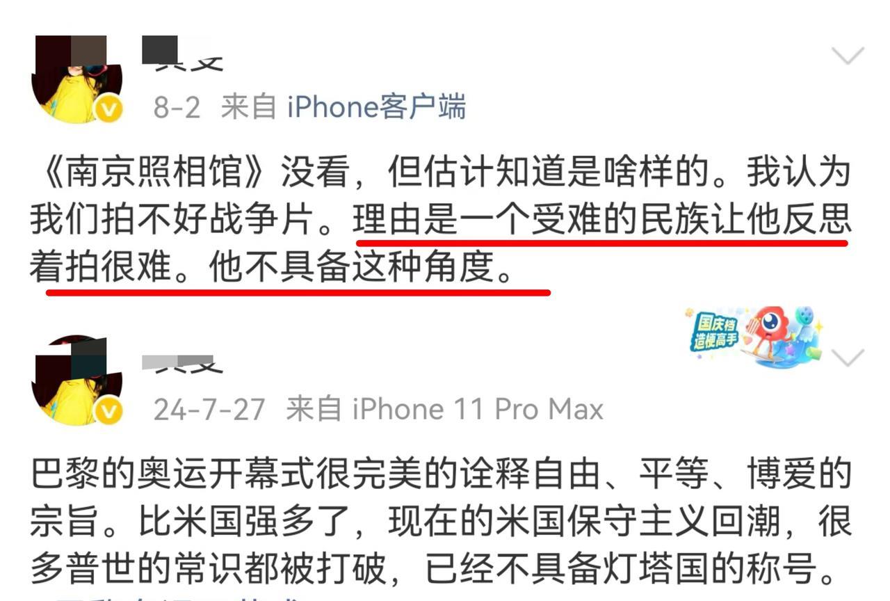 直到看见这位“先锋女作家”把《南京照相馆》说成“圈钱割韭菜的抗日神剧”,才恍然大悟毛主席当年让知青下乡的意义到底是什么,看不起国产电影却把巴黎奥运开幕式奉为神作,喜欢国外的《敦刻尔克》,认为国内拍不好战争片是因为“让一个受难的民族反思很难”,一个作家能这么不接地气,要么是读错书了、要么是日子过得太好了。