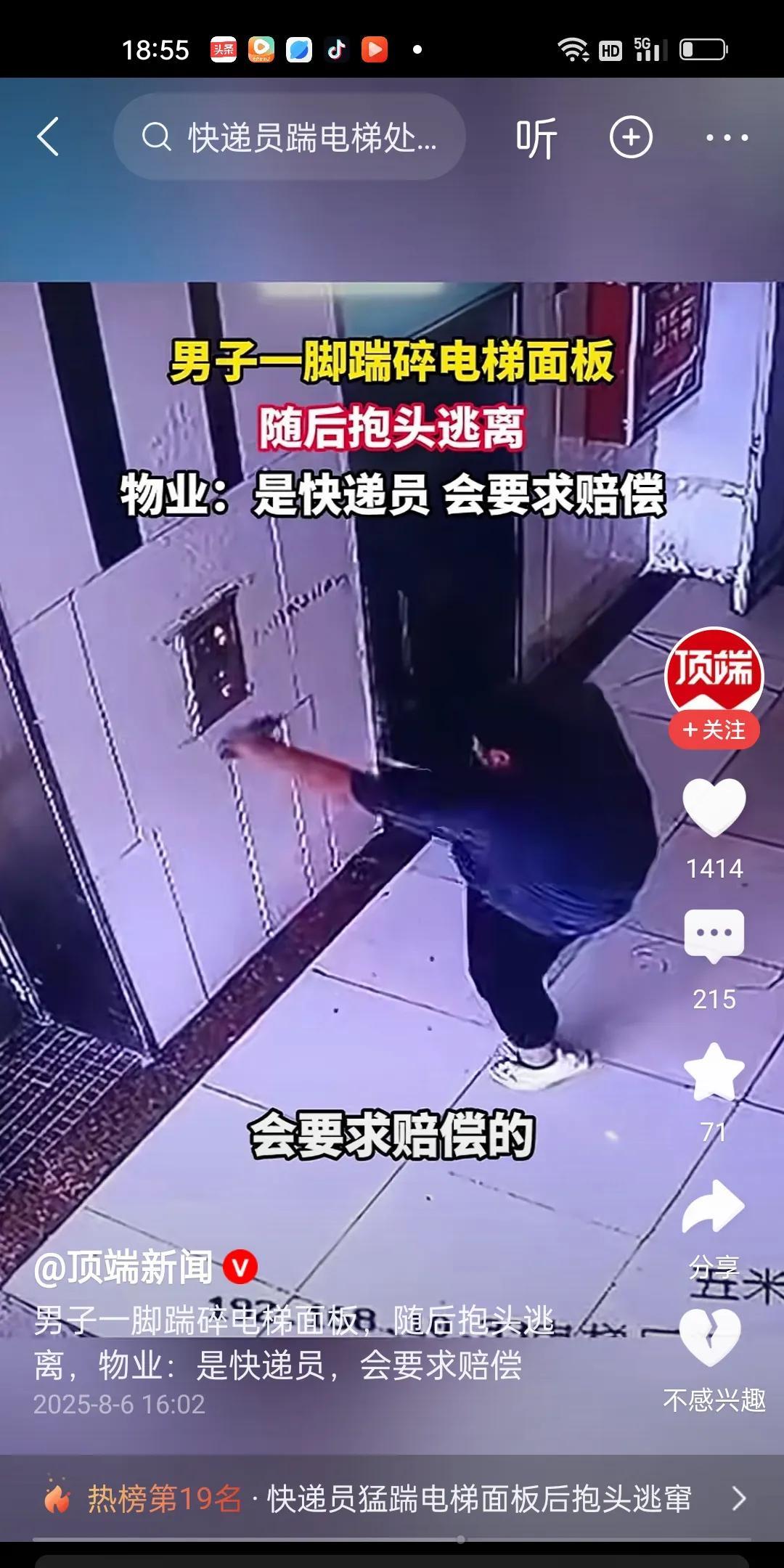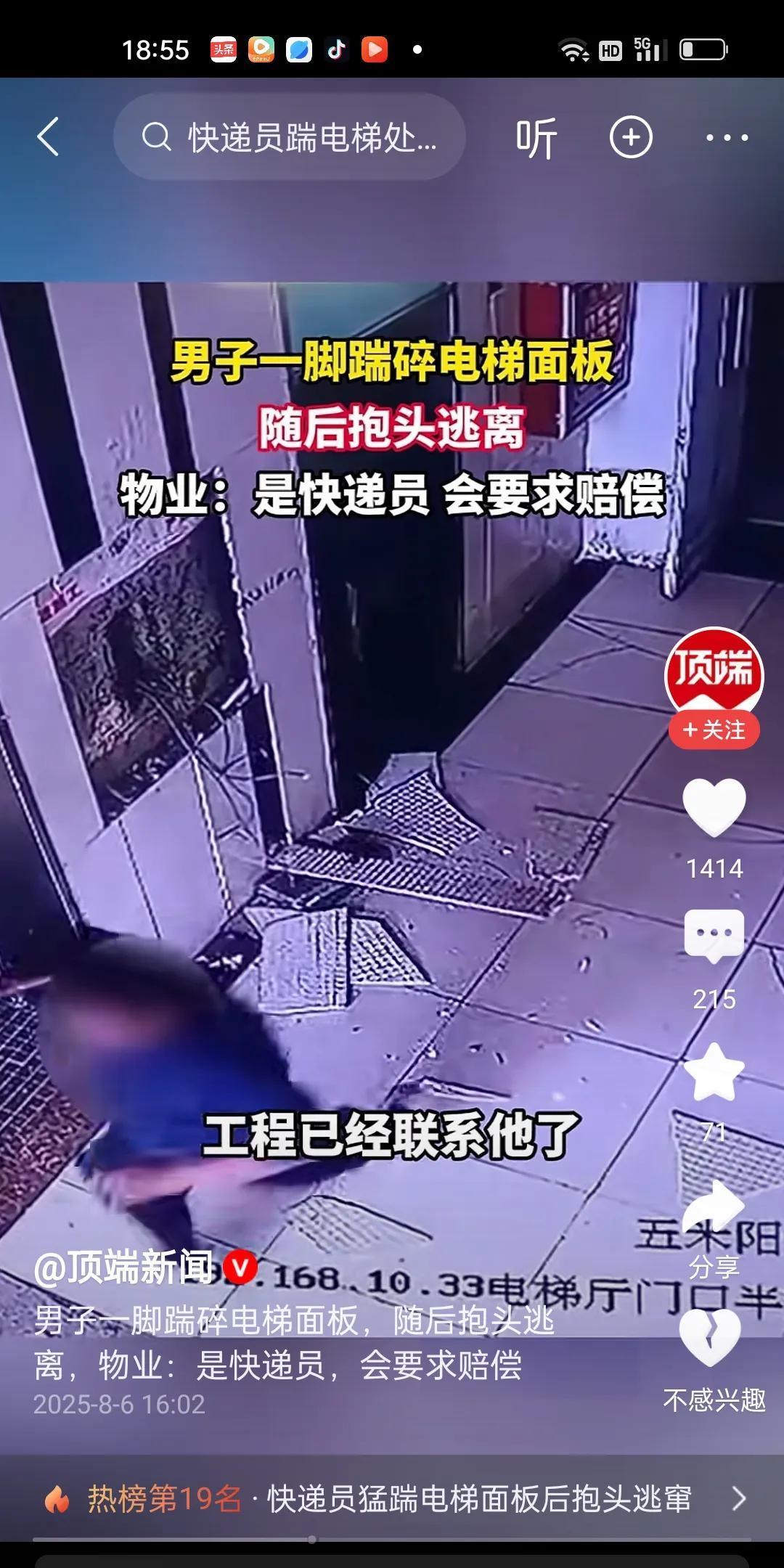 快递员等电梯的时候,狂犬病发作,直接一脚踢碎了电梯面板。他刚开始也有点猝不及防,很快就明白自己犯大事了,仓皇而逃。他以为自己能够不负责任地跑掉,他忘了摄像头把这一切记录的明明白白。呵呵,若要人不知除非己莫为,你在劫难逃。