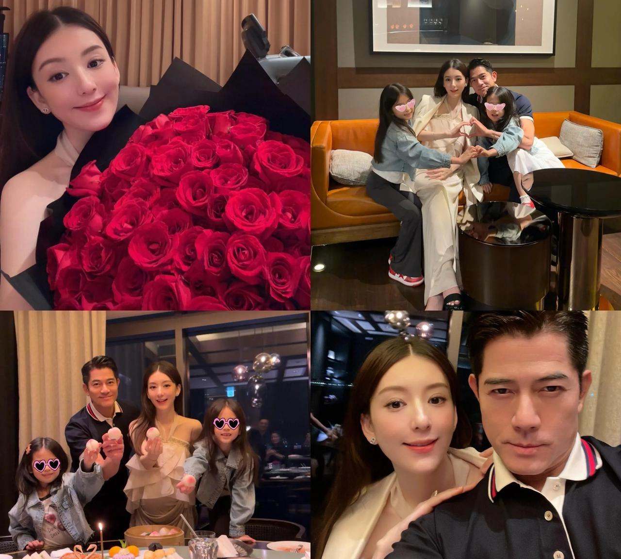 郭富城给方媛庆38岁生日!方媛晒出全家福,昨天是她38岁生日,一家四口在外面聚餐,郭富城给老婆送了多束玫瑰花,还有很多礼物,两个女儿也出镜,仔细看会发现,方媛的肚子很抢镜,脸依然非常漂亮,59岁郭富城状态很年轻