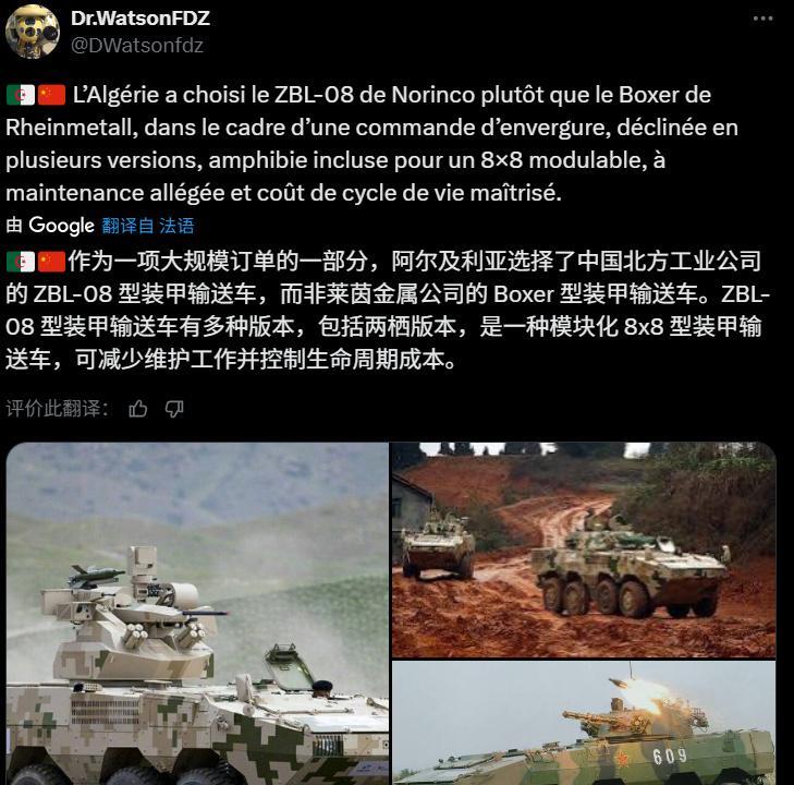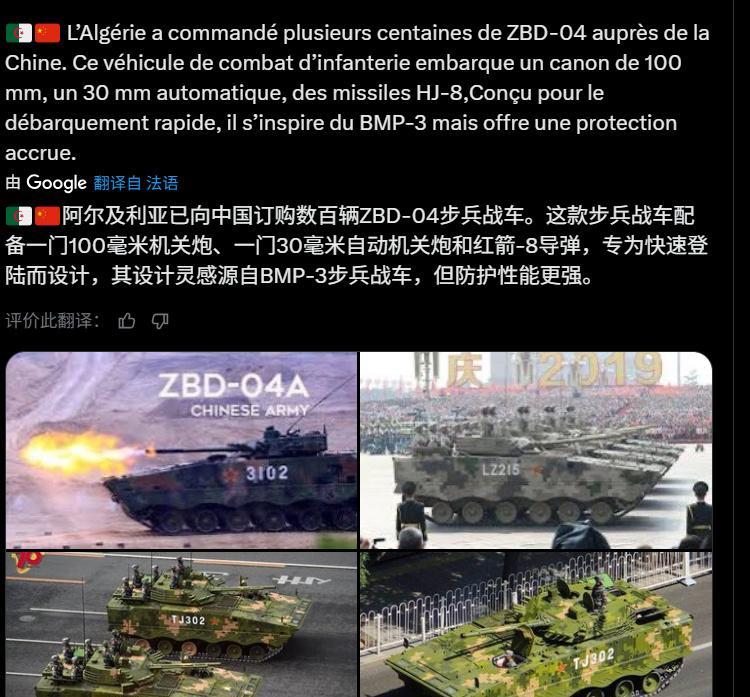 外媒报道称阿尔及利亚陆军将中械化,阿方将大量采购中国步兵战车 路透社消息称:阿尔及利亚军方最终选择了选择中国北方工业公司的VN-1系列轮式步兵战车与VN-11系列履带式步兵战车 。VN-1系列轮式步兵战车即我国ZBL08式轮式步战车和ZTL-11轮式突击炮等8轮陆战平台的外贸版,VN-11系列履带式步兵战车即我国ZBD04型步兵战车的外贸版。报道称作为一项大规模订单的一部分,阿尔及利亚选择了中国北方工业公司的ZBL-08型装甲输送车,而非德国莱茵金属公司的Boxer型装甲输送车。中国ZBL-08型装甲输送车有多种版本,包括两栖版本,是一种模块化8x8型装甲输送车,可减少维护工作并控制生命周期成本。此外阿尔及利亚已向中国北方工业公司订购了数百辆ZBD-04步兵战车。这款步兵战车配备一门100毫米机关炮、一门30毫米自动机关炮和红箭-8反坦克导弹,专为快速登陆而设计,其设计灵感源自前苏联BMP-3步兵战车,但防护性能更强。