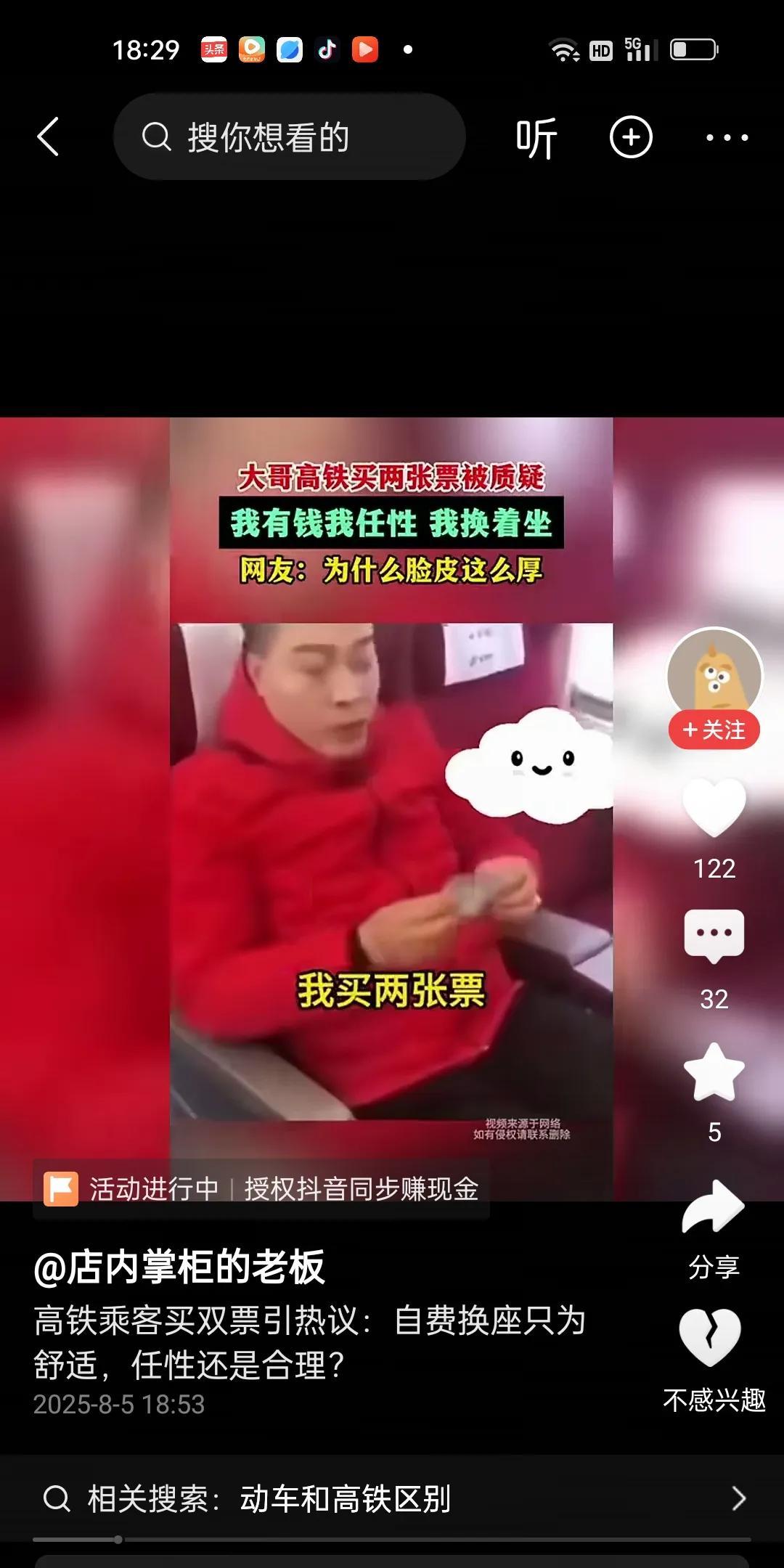 红衣男子在高铁上高调地掏出两张票,对着镜头大声说,我有钱我任性,我买两张票换着坐