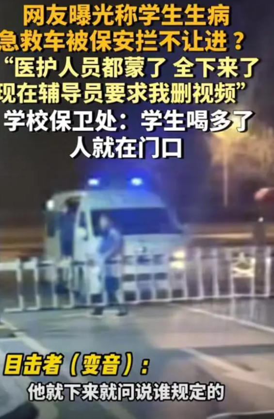 辽宁沈阳,学生急病打了 120,救护车到了门口却进不来,保安还称需要先找领导申请,医护人员争只好用担架把学生抬上车,质问保安“谁规定的?”另一名学生拍下后,还被要求删视频,学校回应了!