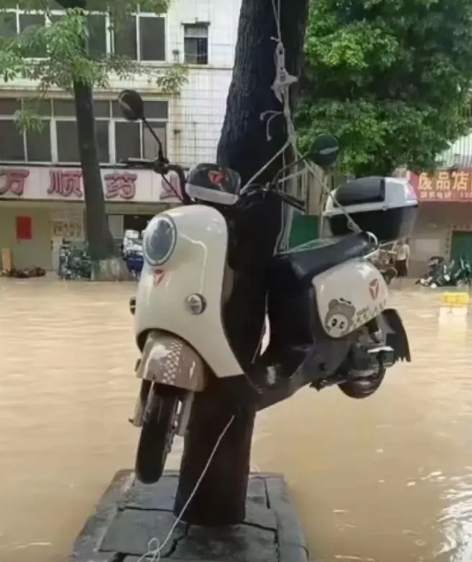 面对暴雨来袭,一些网友太有才了,怕仅有的交通工具再被淹,干脆把电动车直接吊起来。