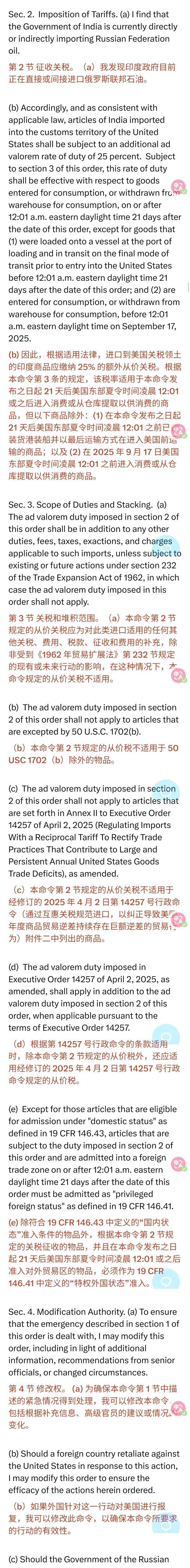 为“惩罚”印度持续购买俄罗斯石油,特朗普此前曾警告在24小时内做出决定,8月6日