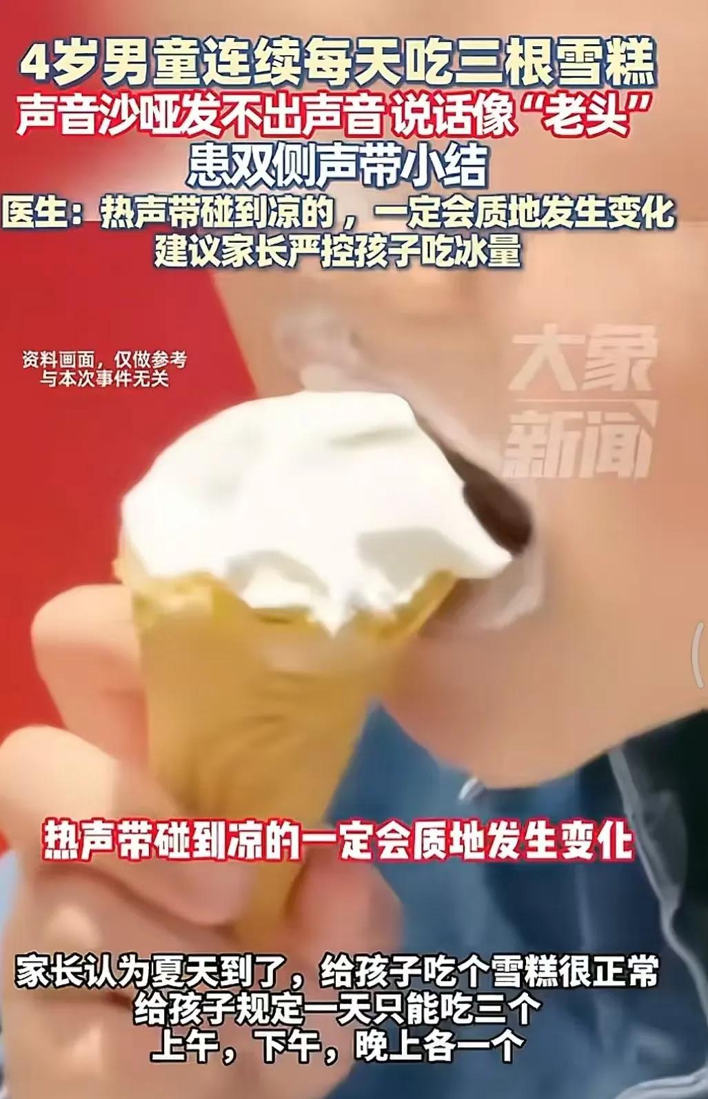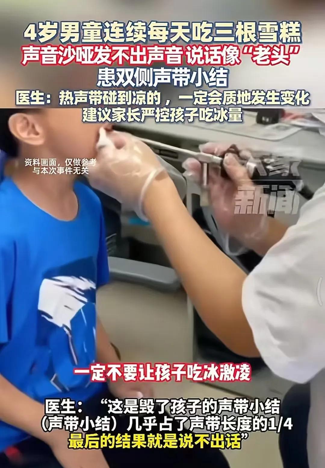 “无知真可怕!”河南郑州,天气炎热,妈妈批发了一箱冰棍放在冰箱里,孩子高兴的不得了,每天吃个三四根,结果有一天起来突然讲不出话来了,慢慢吓的赶紧带他去医院检查,医生的一番话,让妈妈后悔莫及!网友:别说孩子了,我一成年人都中招了! 根据大象新闻8月4日报道,一位母亲心疼放暑假的孩子,索性将一箱冰棍塞进了冰箱。冰箱门开关的声响,成了小男孩眼中最动听的召唤。 家里的空调从早开到晚,可孩子还是整天蔫蔫的,拉着妈妈的衣角念叨要吃冰的,看着孩子被热得红扑扑的脸蛋,妈妈索性在搬了一整箱雪糕回来,花花绿绿塞满了冰箱冷冻层。 孩子像找到了宝藏,每天早上睁开眼,趿着小拖鞋就往厨房跑,踮着脚够冰箱把手,偷偷摸出一根撕开包装纸,小口小口嘬着,冰得直缩脖子也舍不得停。 上午一根,下午两根,有时候趁妈妈收拾碗筷,又会再拿一根。妈妈偶尔撞见,只想着孩子夏天吃点凉的解暑,只要正餐还肯好好吃,也就没太在意,甚至觉得孩子满足的样子挺可爱。 直到一天早上,妈妈叫孩子起床时,听见的不再是往常清脆的“妈妈早”,而是一阵嘶哑的、像被砂纸磨过的声音。 她摸了摸孩子的额头,没发烧,以为是夜里踢被子着凉,让孩子多喝了点温水。可等孩子穿好衣服想跟她说要吃冰棍时,嘴巴张了半天,却只发出气音,小脸瞬间涨得通红,眼里也涌了泪花。 妈妈的心一下子揪紧了,手忙脚乱地带着孩子就往医院冲,孩子攥着她的衣角,时不时张张嘴,却连一声“疼”都说不出来,只能用委屈的眼神望着她。 她看着孩子难受的模样,手心全是汗,脑子里乱糟糟的,想不通前一天还蹦蹦跳跳的孩子,怎么突然就说不出话了。 到了儿科诊室,医生用压舌板检查时,孩子因为紧张和不适扭动着,喉咙里发出细碎的呜咽声。听完妈妈说孩子最近的饮食,尤其是每天三四根冰棍的事,医生叹了口。 四岁孩子的声带还没长结实,就像刚抽芽的嫩苗,短时间大量的冰棍往嘴里塞,声带表面的血管会猛地收缩,紧接着又因为刺激反射性扩张,黏膜下的毛细血管全破了,组织液渗出来肿成一团,自然发不出声音。 治疗方案很快出来:连续两周不能说话,每天要做三次雾化。第一天做雾化时,面罩刚碰到孩子的脸,他就因为害怕和不适哭闹起来,却只能发出闷闷的哼唧声。 妈妈抱着他,能感觉到怀里小小的身体在发抖,心里又酸又悔,眼泪在眼眶里打了好几个转,恨自己怎么就没早点想到这些。 这件事被上传到网络上之后,引起了网友们的热议。有网友表示,自己小时候天天早上不吃饭就拿雪糕当早饭,照样跑着跳着上学,“或许不是冰棍的事?” 更多人是第一次听说冰棍伤声带。有位妈妈说,以前只知道冰的吃多了会拉肚子,从没想过会影响说话,“以后再也不整箱买了,想吃就去楼下便利店买一根,至少能控制住量”。 其实仔细想想,生活里这样的“无知”常常藏在细节里。妈妈不是不爱孩子,恰恰是因为疼孩子,才想让他在大热天里过得舒服点,却没料到这份好意会变成伤害。 就像很多家长,总觉得“孩子想吃就给”是疼他,却忘了孩子的身体和成人不一样,那些看似不起眼的习惯,比如冰饮、零食、熬夜,都可能在不知不觉中埋下隐患。 养孩子就像走一条长路,路边藏着不少看不见的坑。有时候,多一点留意,多一份了解,就能避开很多麻烦。 毕竟,比起一时的满足,孩子能平平安安、健健康康地长大,才是最实在的事。