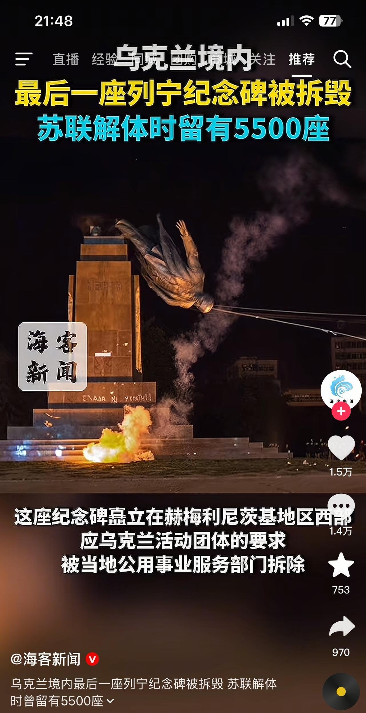 乌克兰境内最后一座列宁纪念碑被拆毁! 乌克兰再次去俄化,拆毁了最后一座列宁雕像。
