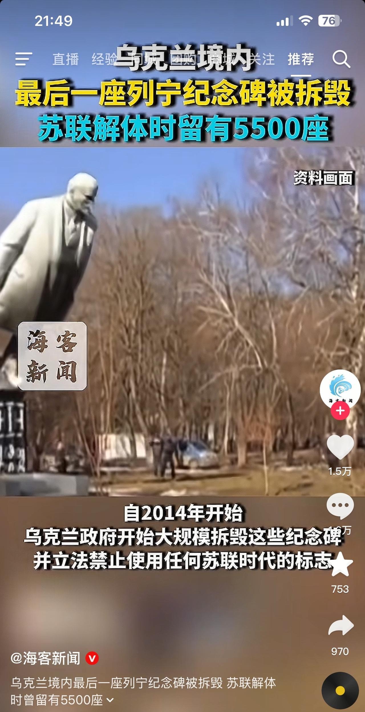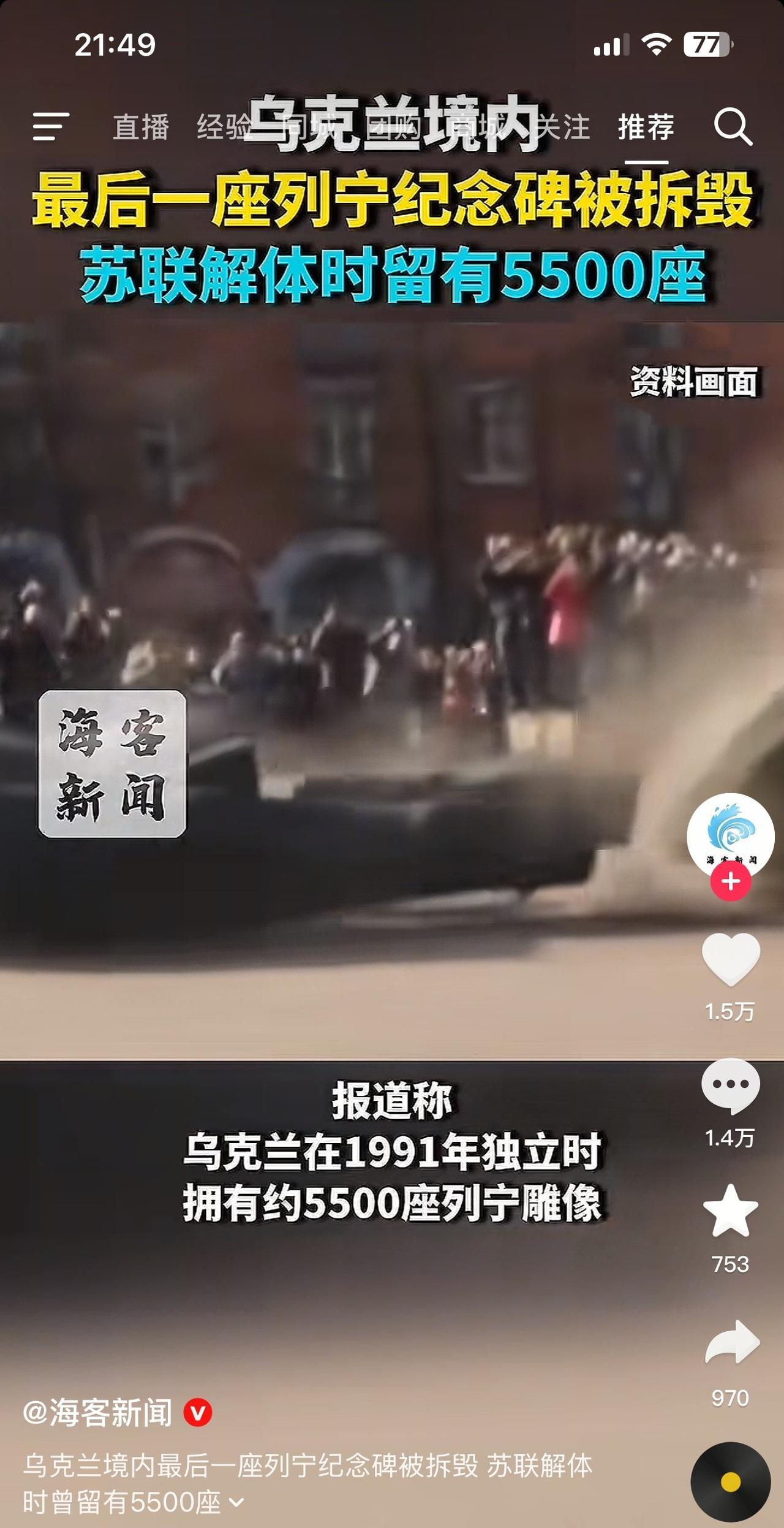 乌克兰境内最后一座列宁纪念碑被拆毁! 乌克兰再次去俄化,拆毁了最后一座列宁雕像。苏联时期,在乌克兰境内留下了5500座列宁雕像,从2014年俄罗斯占领了克里米亚开始,愤怒的乌克兰军民就逐渐去俄化,将沙俄与苏联时期留下的雕像一律拆除,地名全部更改。 拆除苏联遗留的雕像并非个例,俄罗斯的盟友与邻居,中亚多个国家也几乎全部拆除雕像去俄化,有的甚至取缔俄语学校,禁止俄语活动,违者或将进行逮捕重罚。