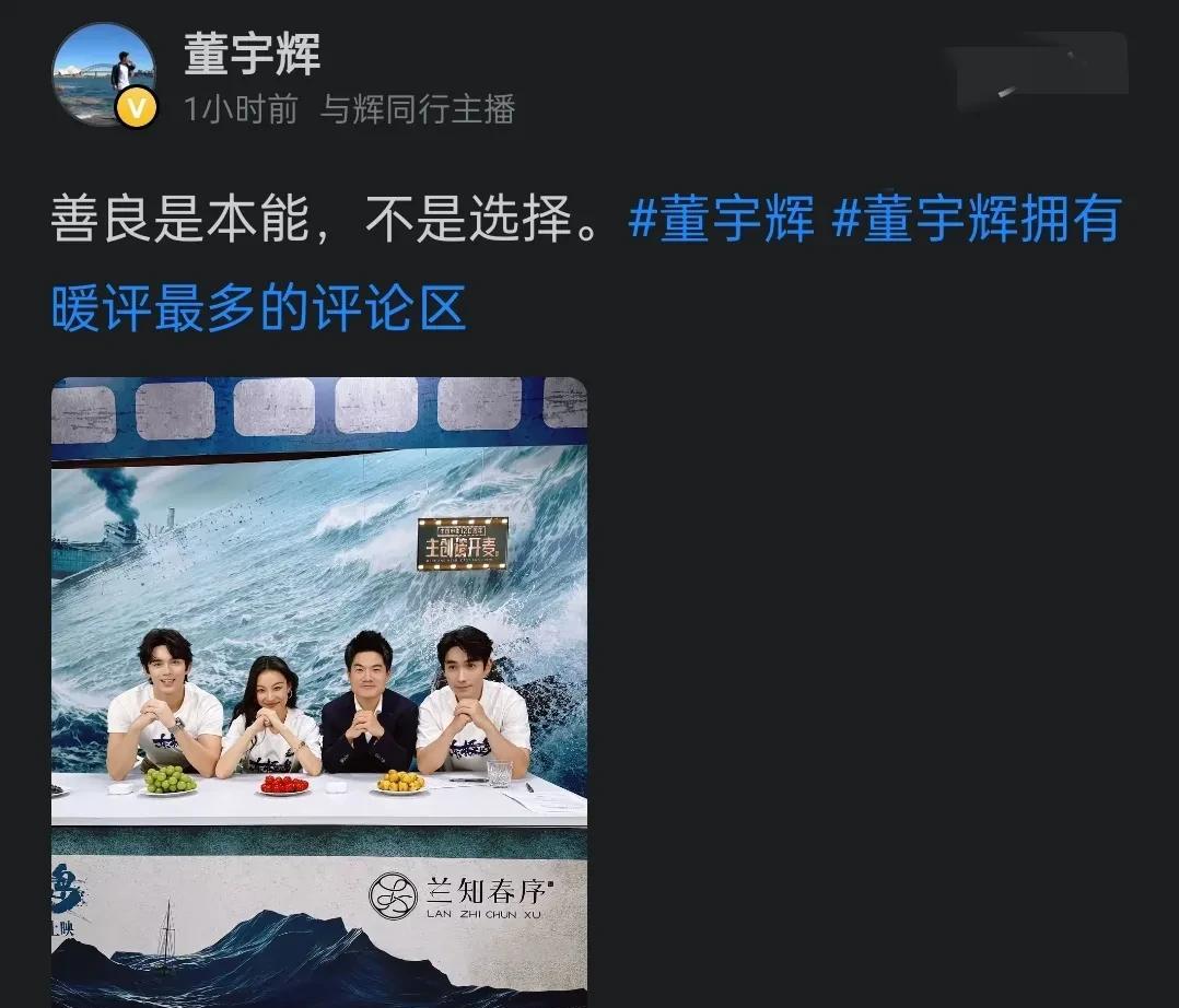 董宇辉采访《东极岛》剧组最让人刮目相看的,不是梁静透露的秘密,也不是主创全员到齐的排面,而是其与三位主演的这张合影。 《东极岛》上映之前的重要日子,管虎、梁静、费振翔及朱一龙、倪妮、吴磊全部来到董宇辉的直播间。 这次访谈非常精彩,大家其乐融融,10万加的在线人数,电影票也是很快被抢光,梁静还透露自己是董宇辉的第一批粉丝。 访谈结束后,董宇辉晒出了一张与三位主演的合影。 只见朱一龙和吴磊两大男主站在两边,把中间挨着倪妮的位置留给了董宇辉。 要知道在四个人的合影中,这个位置就相当于c位无疑。 可见,董宇辉还是非常受尊敬的。 #头号创作者激励计划#