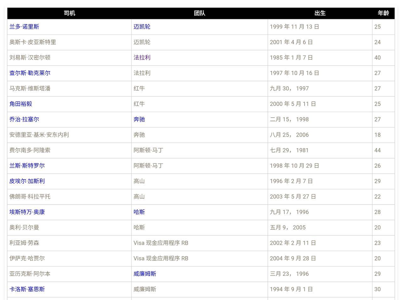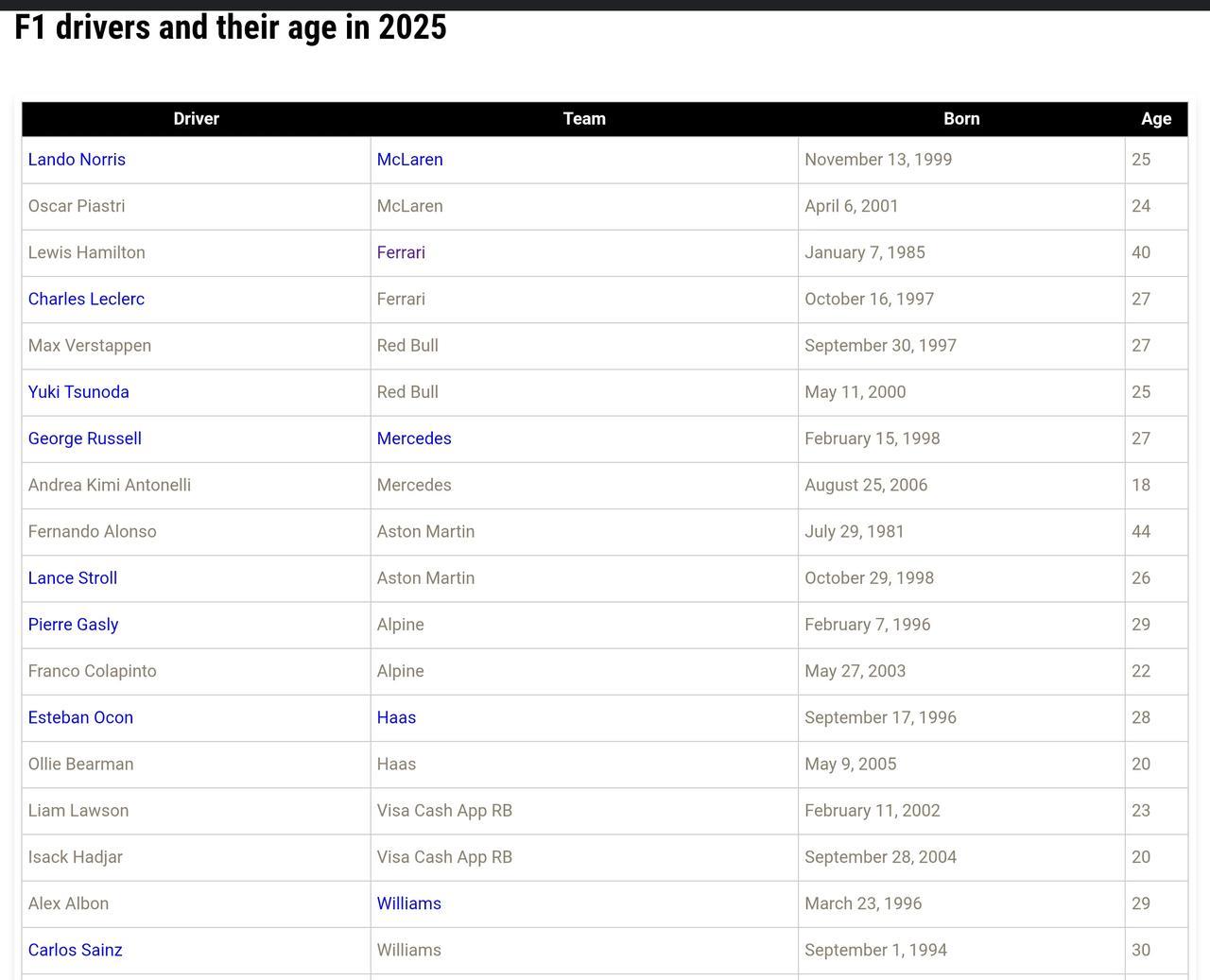 2025年F1的20位车手年龄几何,谁是最年长的车手,那么最年轻的又是谁呢? 如
