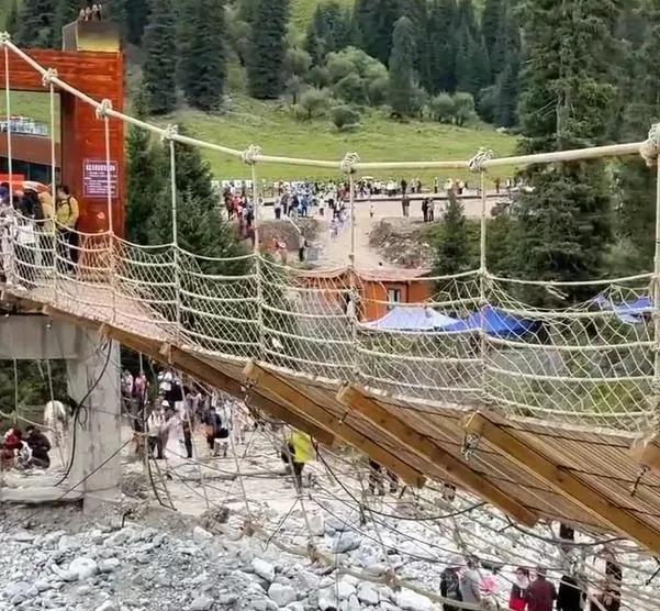 朋友说他昨天在新疆夏塔景区游玩,旁边将军桥突然断裂,多名游客被冲走,场面真的好吓