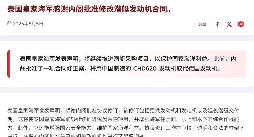 泰国内阁批准采购中国潜艇合同,使用中国国产发动机,通过测试中国发动机完全合格,泰