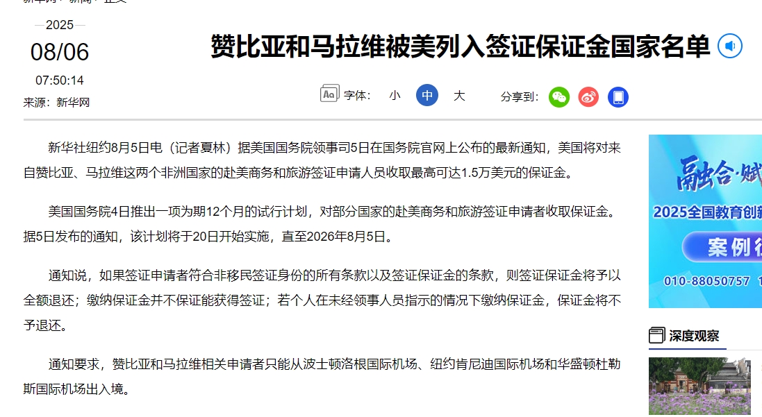 信息来源:极光新闻东北网 美国签证出新规!想去先押钱,最高要交1.5万美元! 新华网 赞比亚和马拉维被美列入签证保证金国家名单