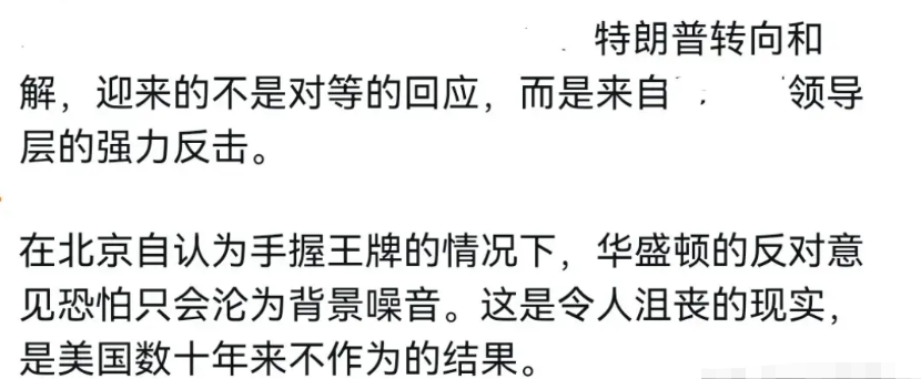 美国感到非常的郁闷!8月6日,华尔街日报刊文声称,特朗普转向和解,迎来的不是对等的回应,而是来自中国领导层的强力反击。美媒声称,在北京自认为手握王牌的情况下,华盛顿的反对意见恐怕只会沦为背景噪音。这是令人沮丧的现实,这是美国数十年来不作为的结果。