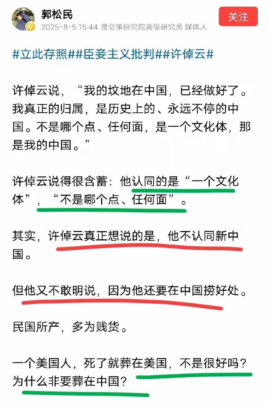 美国人许绰云怎么就成了中国青年的精神导师了?他又给我们留下了什么精神遗产?有吗?好像并没有吧。#头号创作者激励计划# 身在美国的许绰云,在谈到中国的时候,他故意在模糊中国这个概念,他没有任何一句话提到现在的中国——也就是1949年成立的新中国。 所以,对于许绰云,我更赞同郭先生的观点。尤其是,许绰云加入美国籍已经几十年了,你安心的做了几十年美国人,现在去世,却想安葬在现在的中国。 为什么? 凭什么? 今日之中国再大,也不该给他留那一片墓地。 就这样。